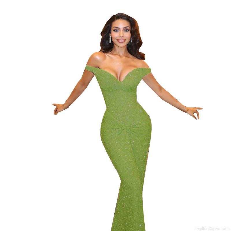 • Elegant Green Sequin Polyester Spandex Evening Gown Women Sexy Off-Shoulder Mermaid Maxi Dress For Wedding Party Gala Special Occasion Night Club Wear
