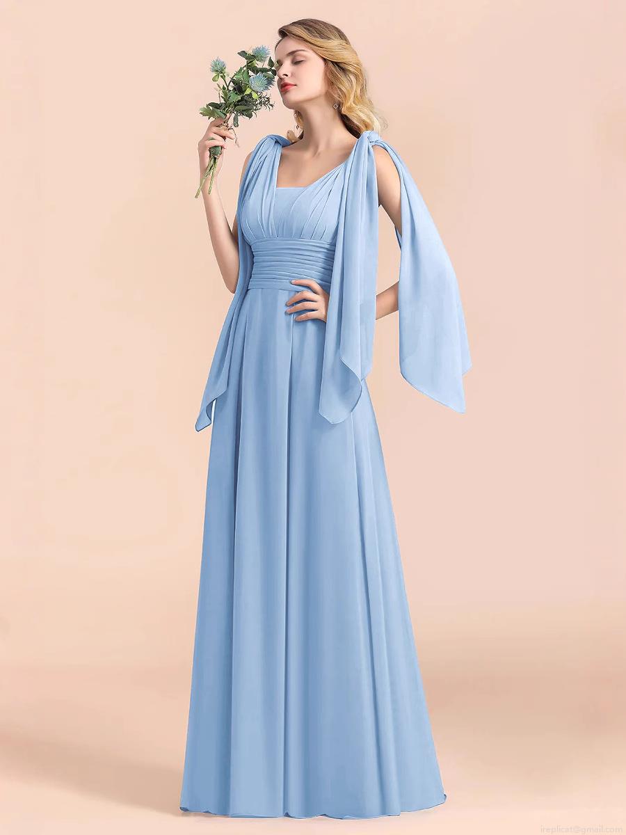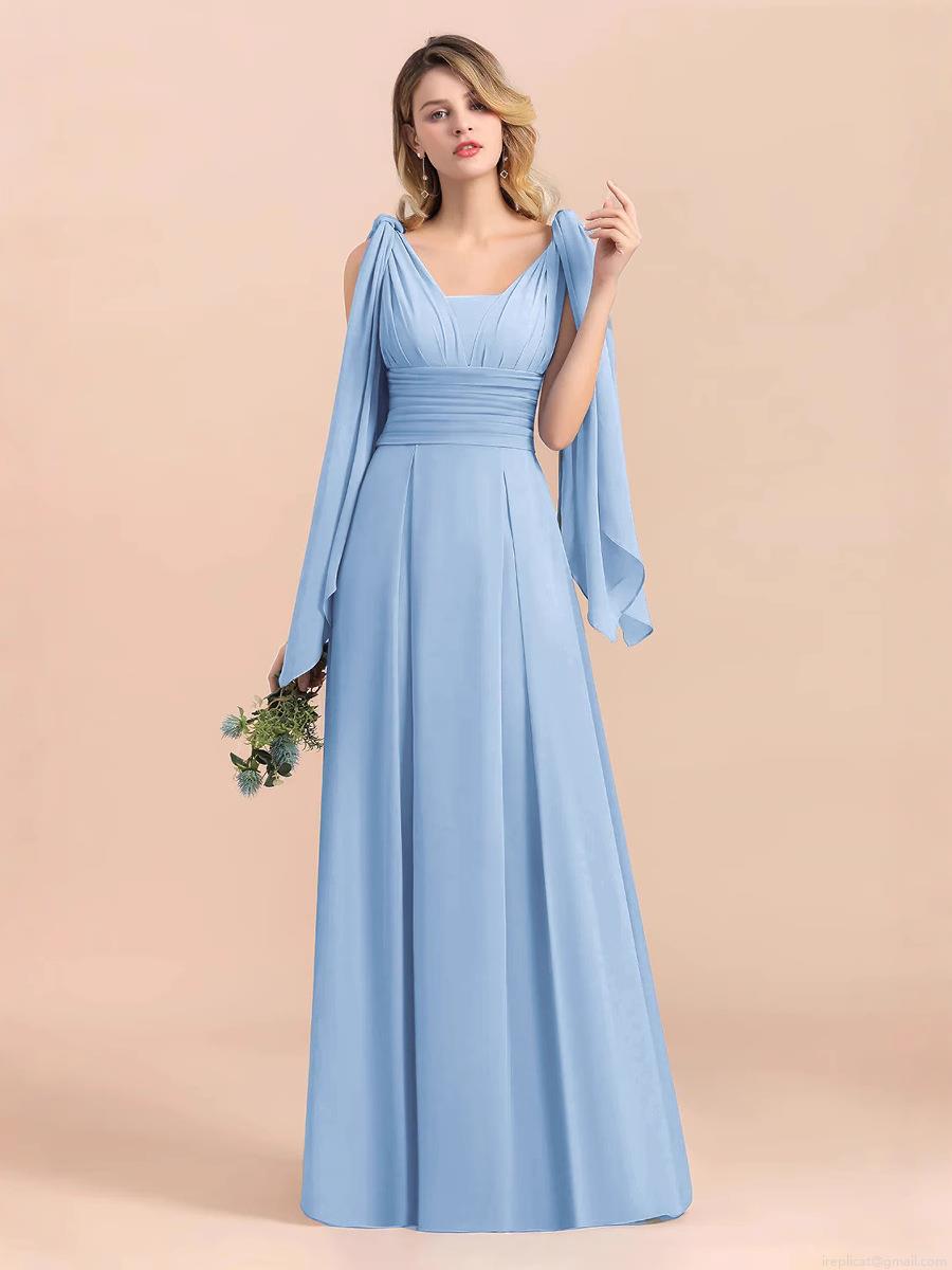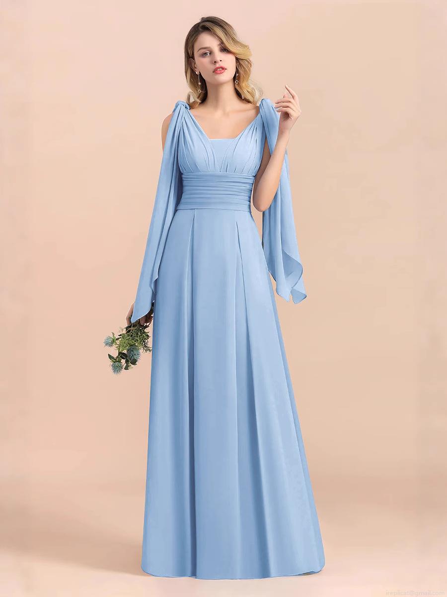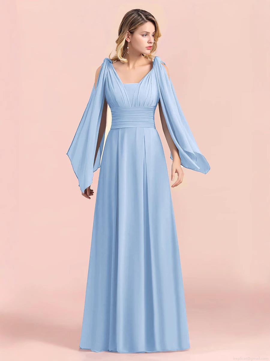 • Elegant Light Blue Chiffon Maxi Evening Dress With Cape Sleeves V-Neck High Waist Ruched Party Gown For Women Prom Wedding Guest Dresses