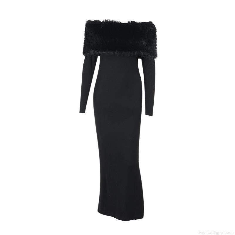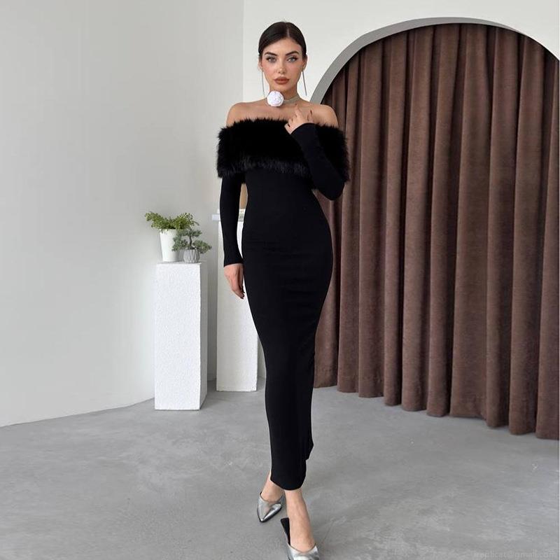Elegant Off-Shoulder Faux Fur Collar Slim Long Dress Women Party Evening Polyester Spandex High Waist Hip-Hugging Bodycon Maxi Dress For Ladies