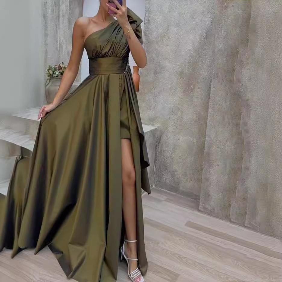 • Elegant One Shoulder Satin Evening Dress High Slit Ruched Maxi Gown For Women Prom Party Wedding Guest Dress Olive Green Formal Dress