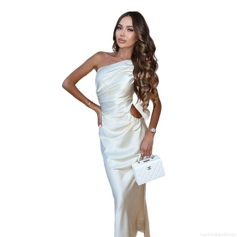 • Elegant One Shoulder Satin Gown Dress Sexy Cutout Waist High Slit Slim Fit Evening Party Wedding Guest Maxi Dress For Women Sleeveless Solid Color High-end Formal Occasion Outfits