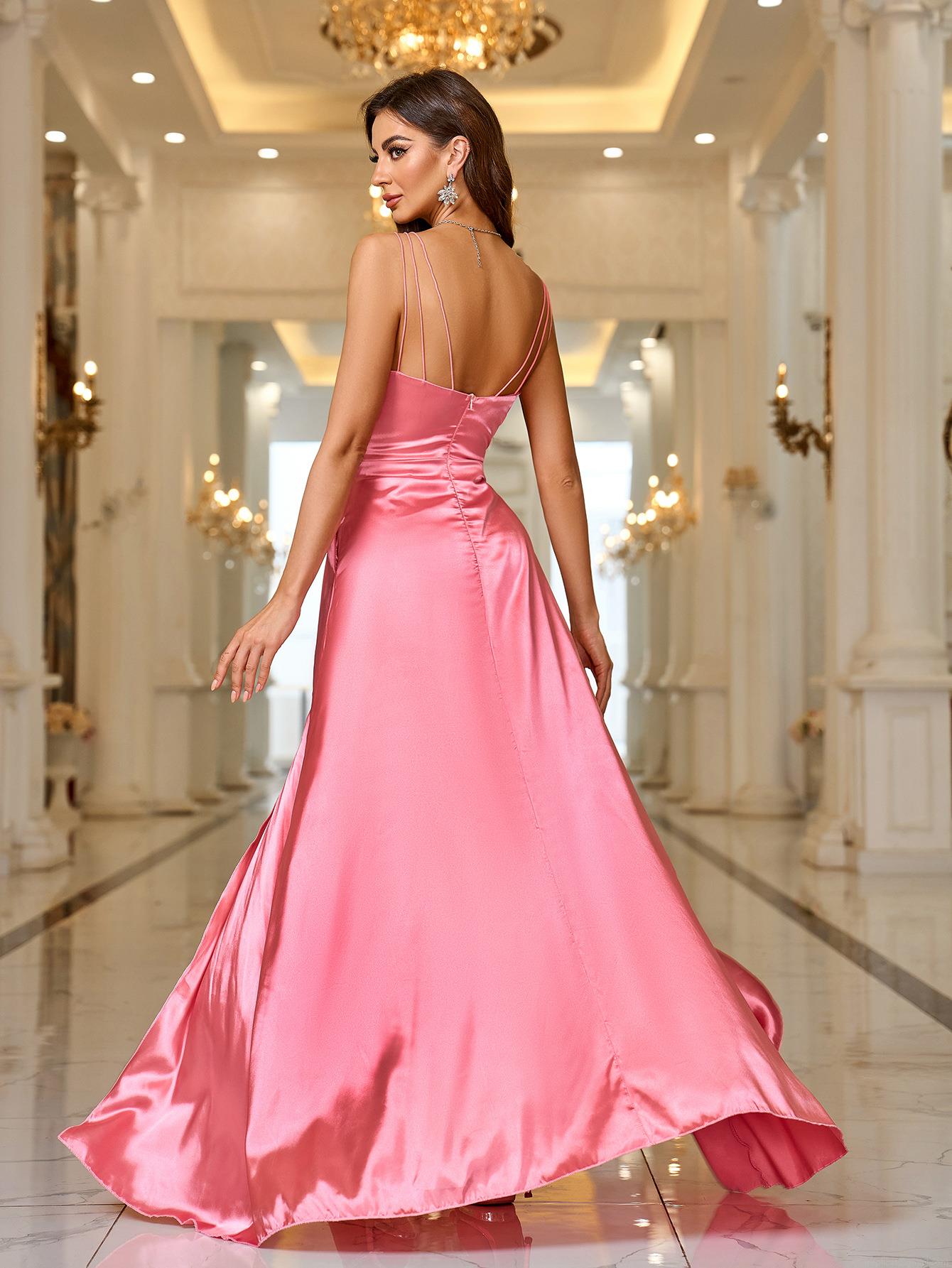 • Elegant Pink Polyester Satin Spaghetti Strap Evening Dress High Slit Square Neck Pockets Floor Length Maxi Prom Gown For Women Wedding Party Bridesmaid