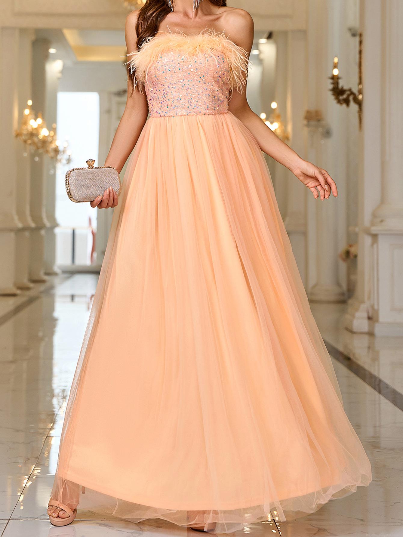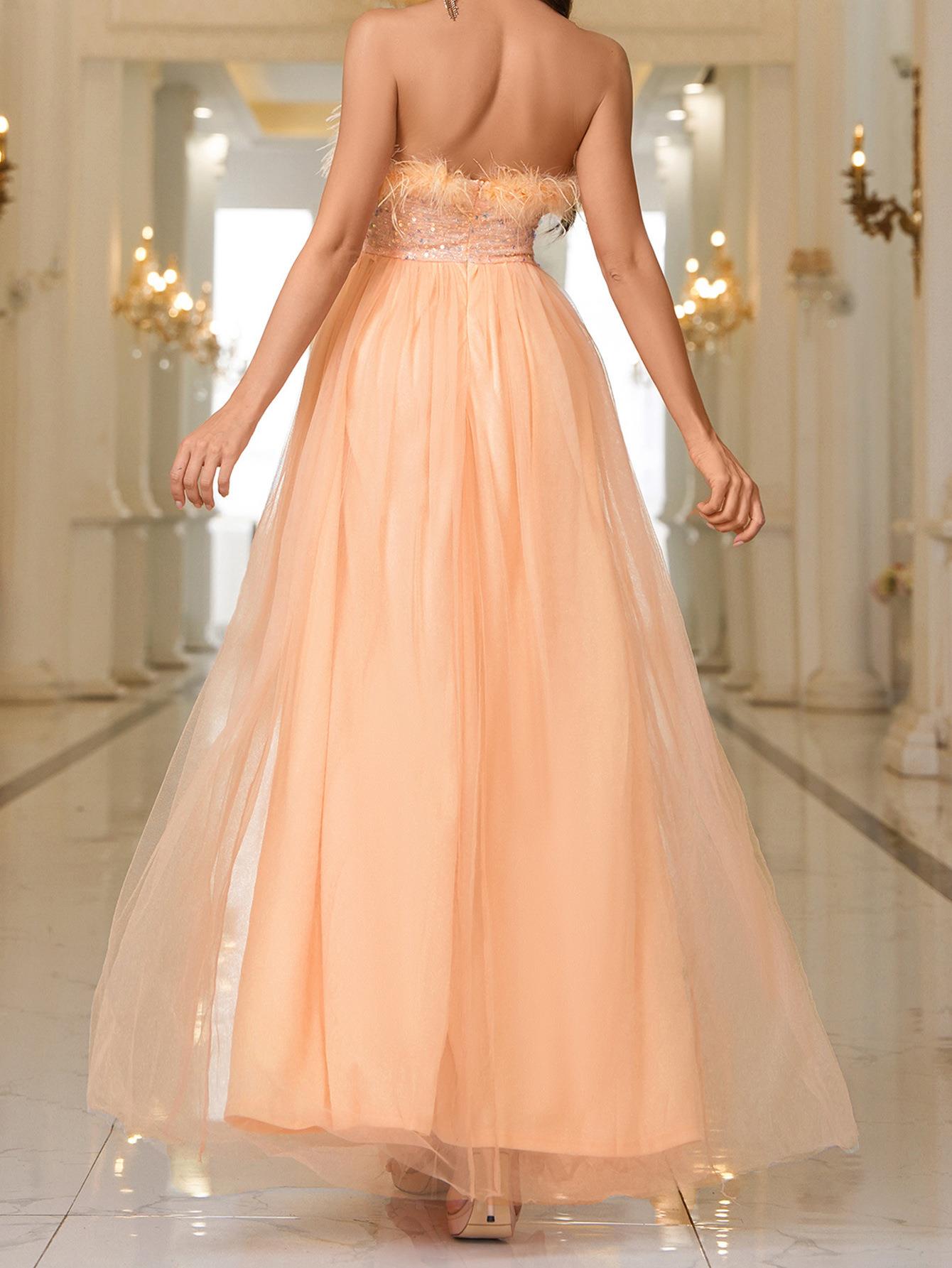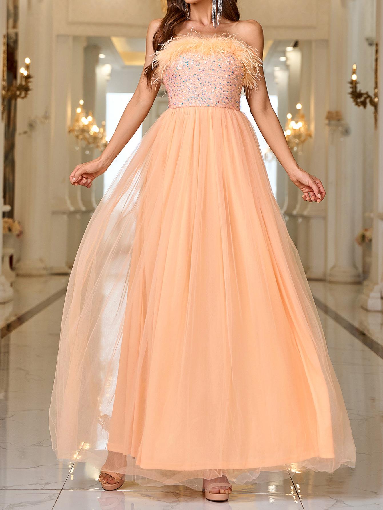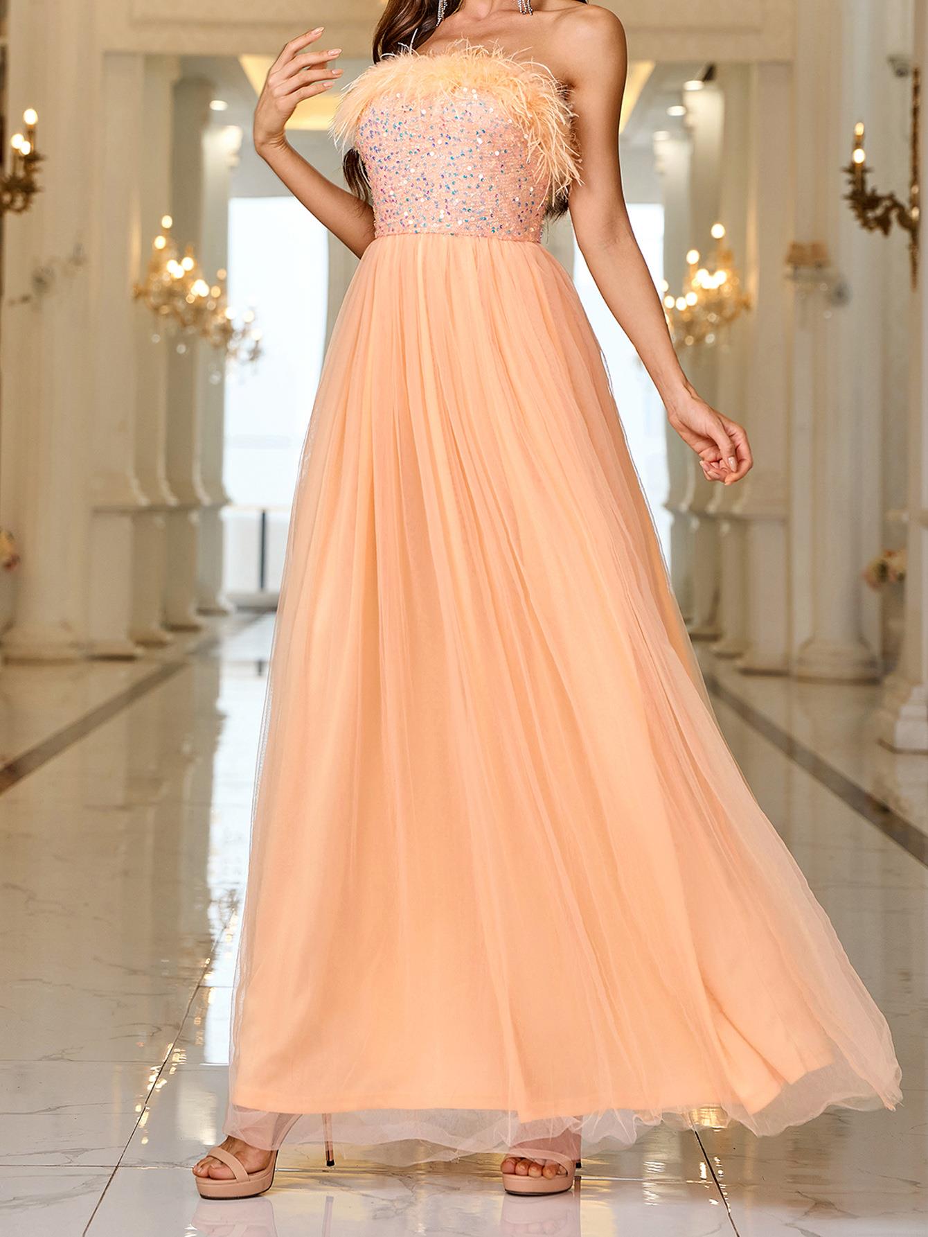 • Elegant Sequin Mesh Maxi Dress With Feather Trim Strapless Tube Top Evening Party Prom Gown For Women Peach Apricot Formal Sleeveless Dress