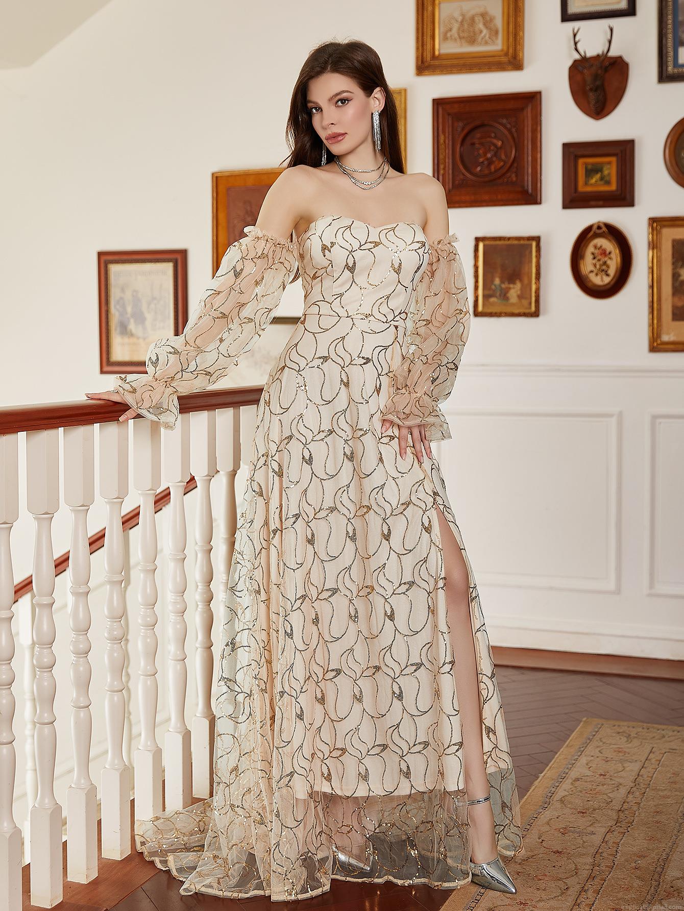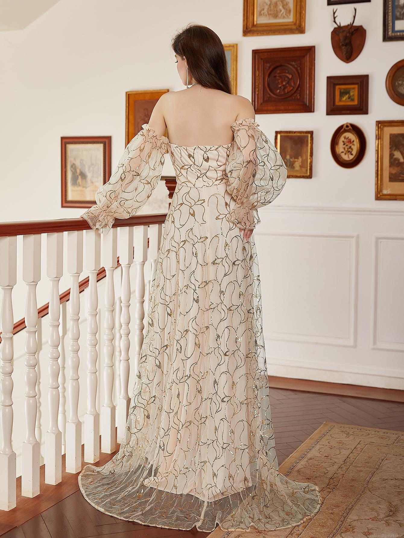 Elegant Sexy Gold Sequined Evening Gown Women Luxury Off-Shoulder Puff Sleeve Tulle Mesh High Slit Maxi Dress For Wedding Party Gala Banquet