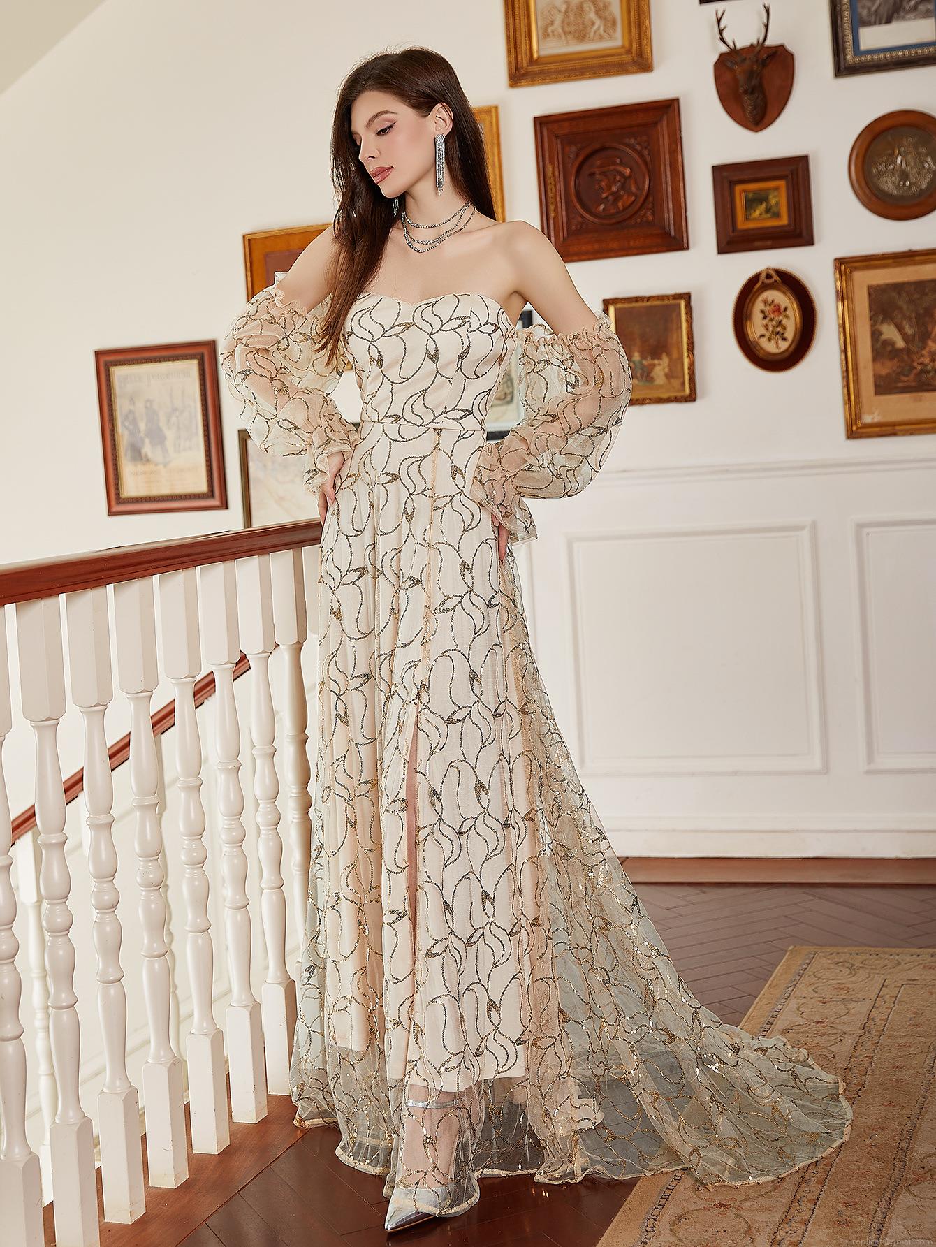 Sequin, Embroidery, Puff Sleeves, Off-shoulder, High Fork, Golden Leaf Embroidery, Wave-patterned Sequins