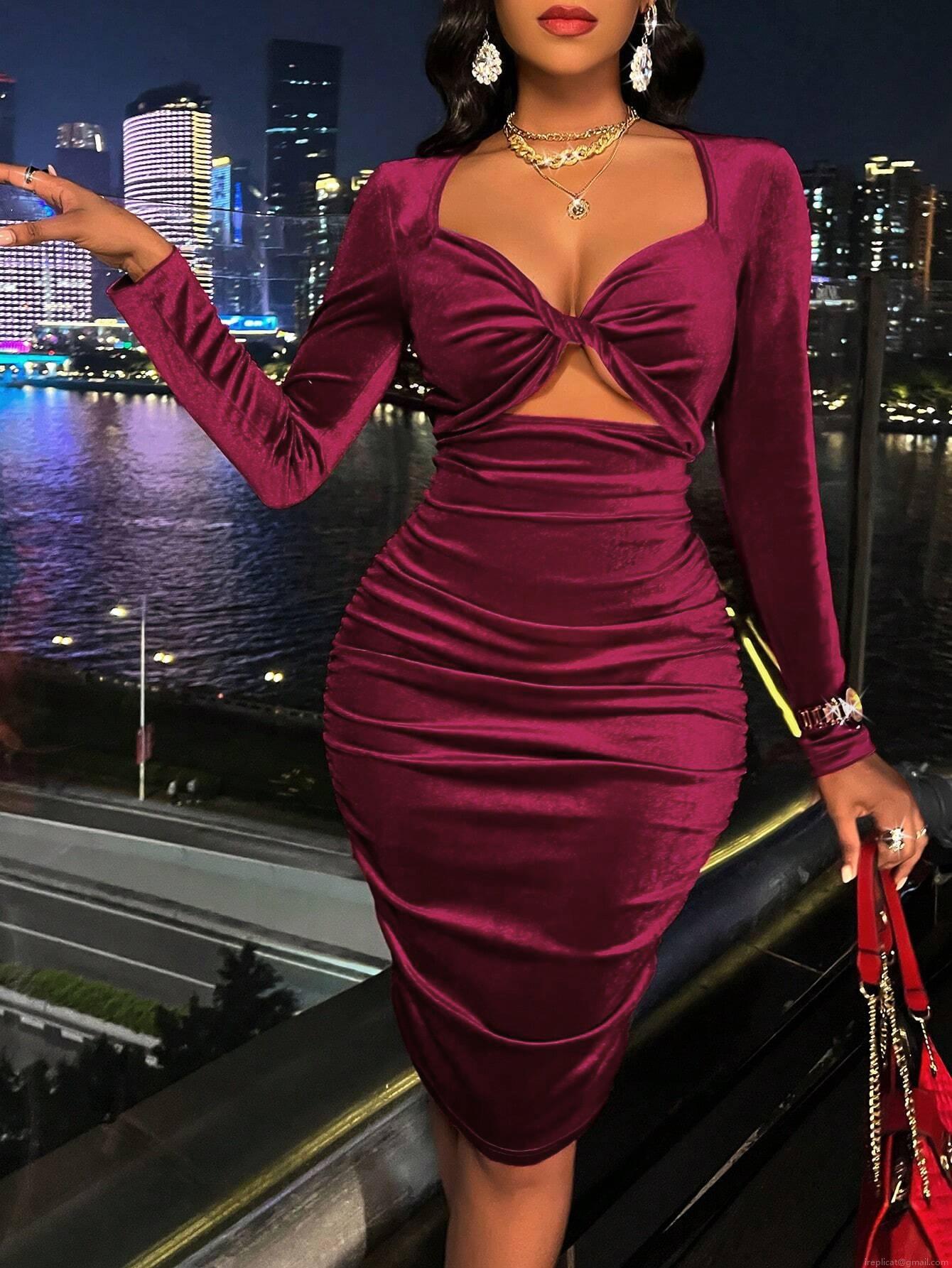 • Elegant Sexy V Neck Velvet Dress Women Hollow Out Knot Front Ruched Bodycon Midi Dress Long Sleeve Polyester Elastane Party Nightclub Evening Outfits