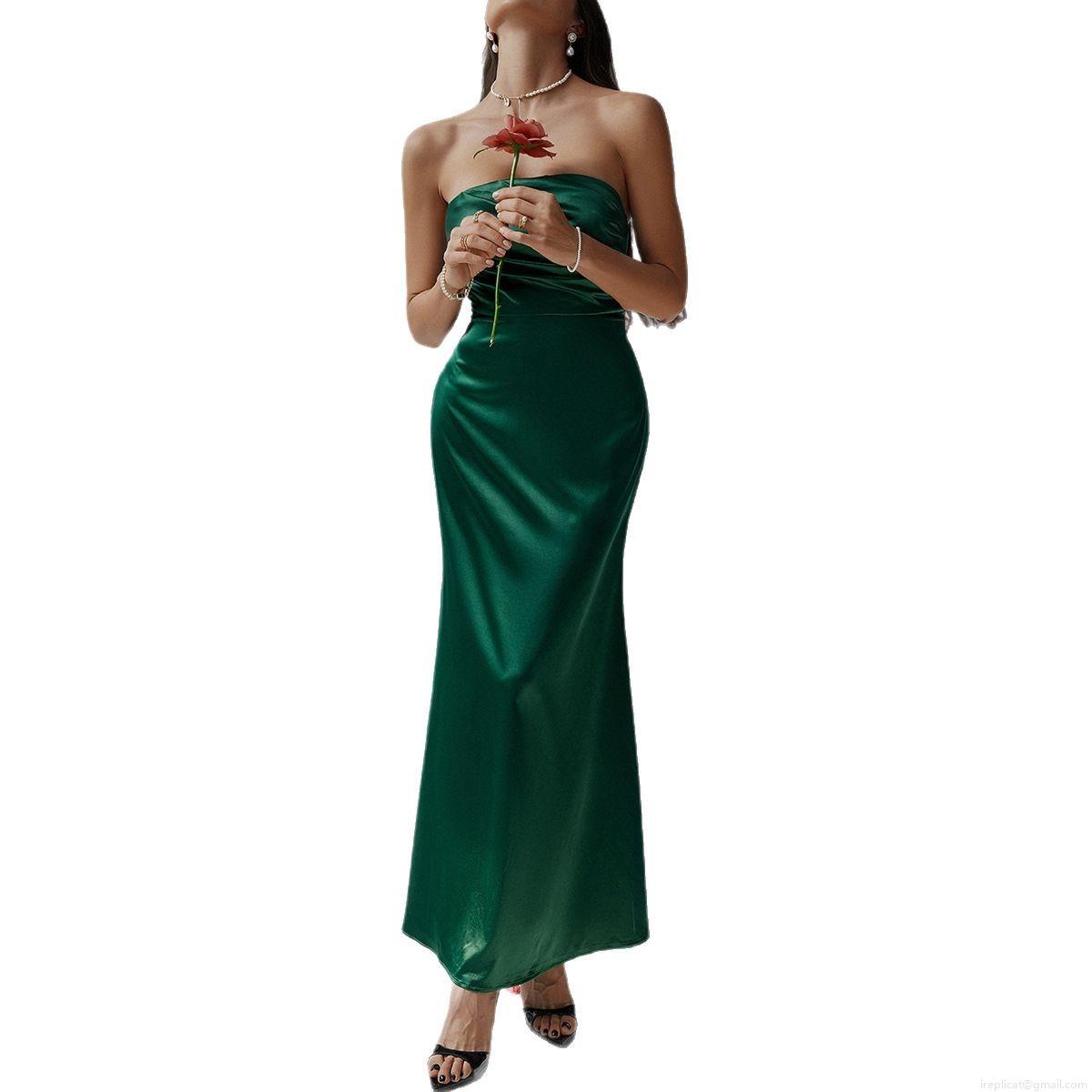 • Elegant Strapless Satin Long Dress Sexy Bodycon Pleated Evening Party Gown For Women Wedding Formal Summer Polyester Elastane Maxi Dress