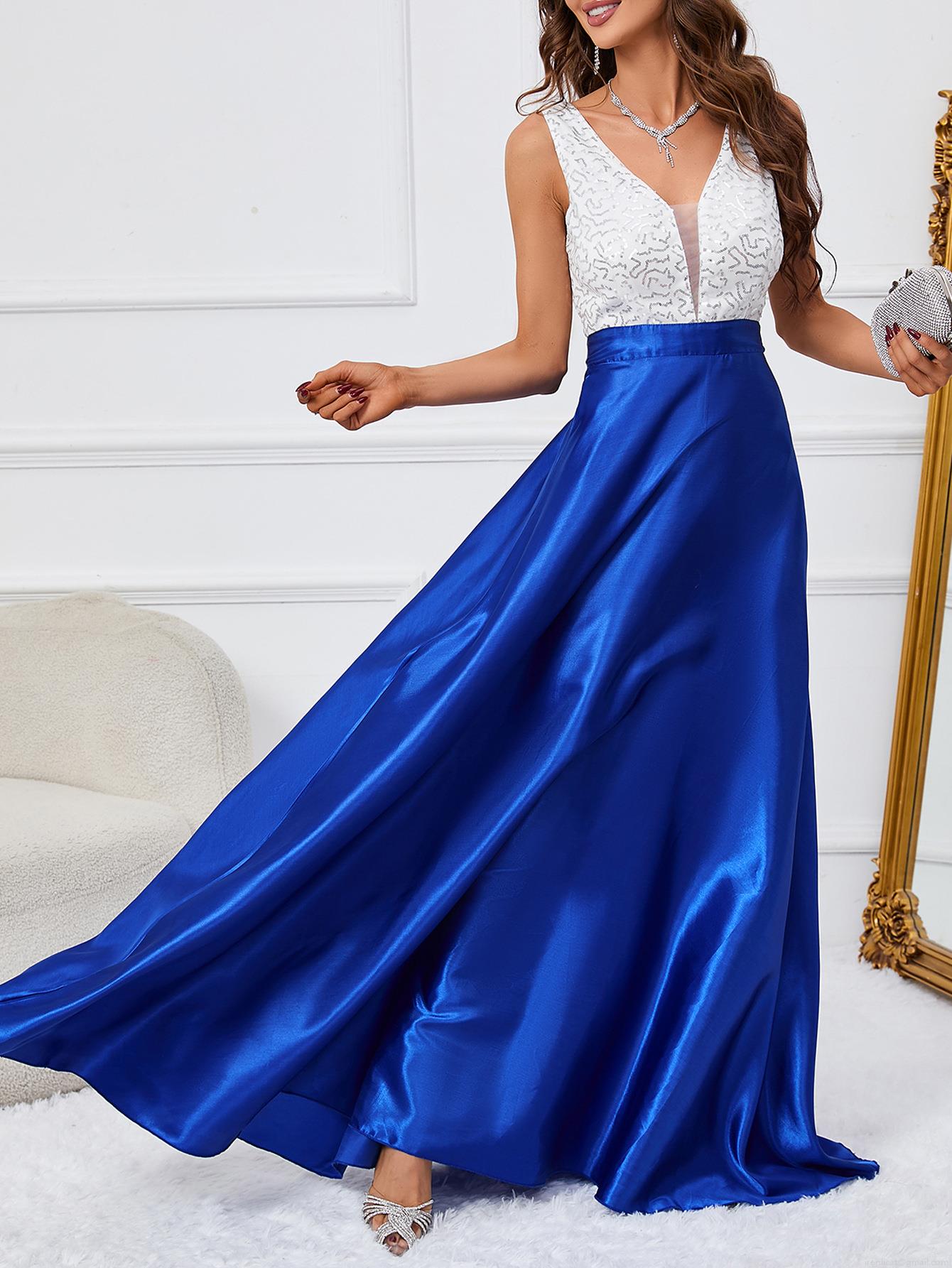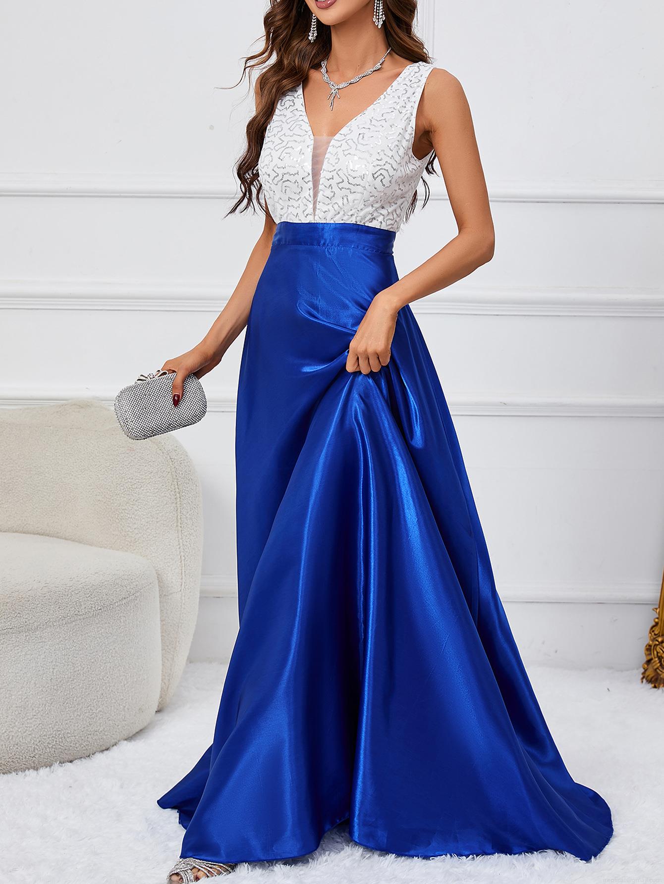 • Elegant V-Neck Sleeveless Sequin Patchwork Maxi Dress Sexy Backless Satin A-Line Evening Party Gown For Women