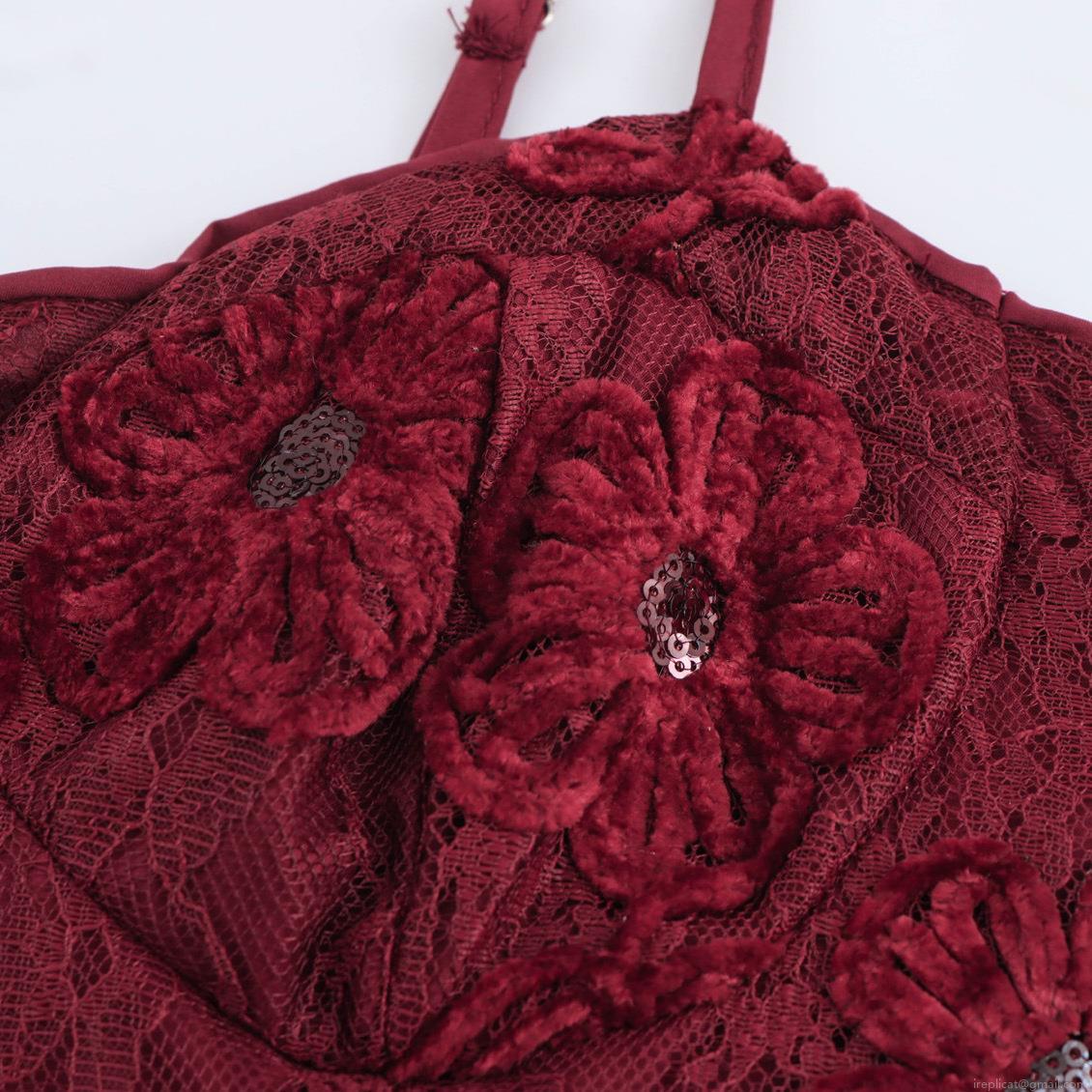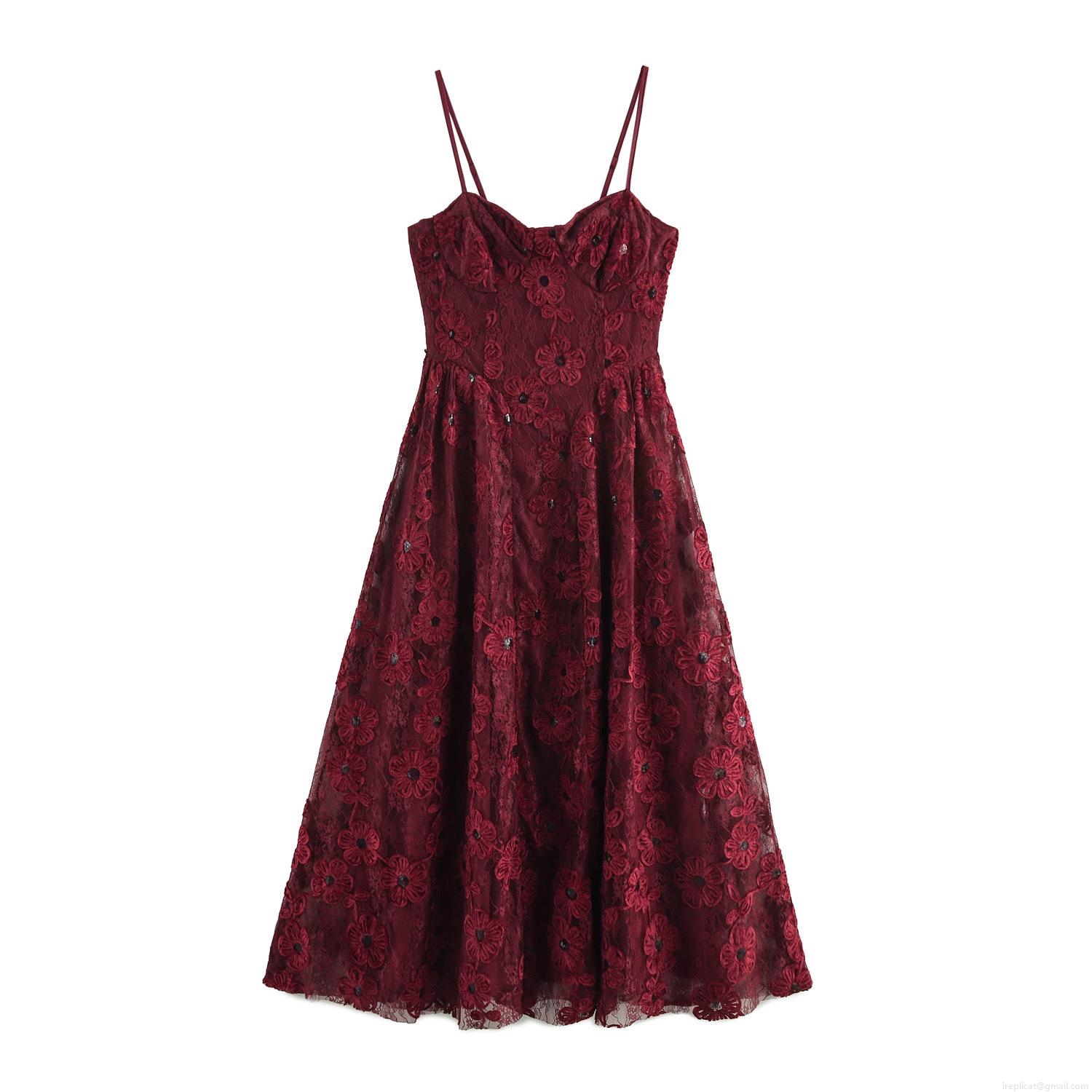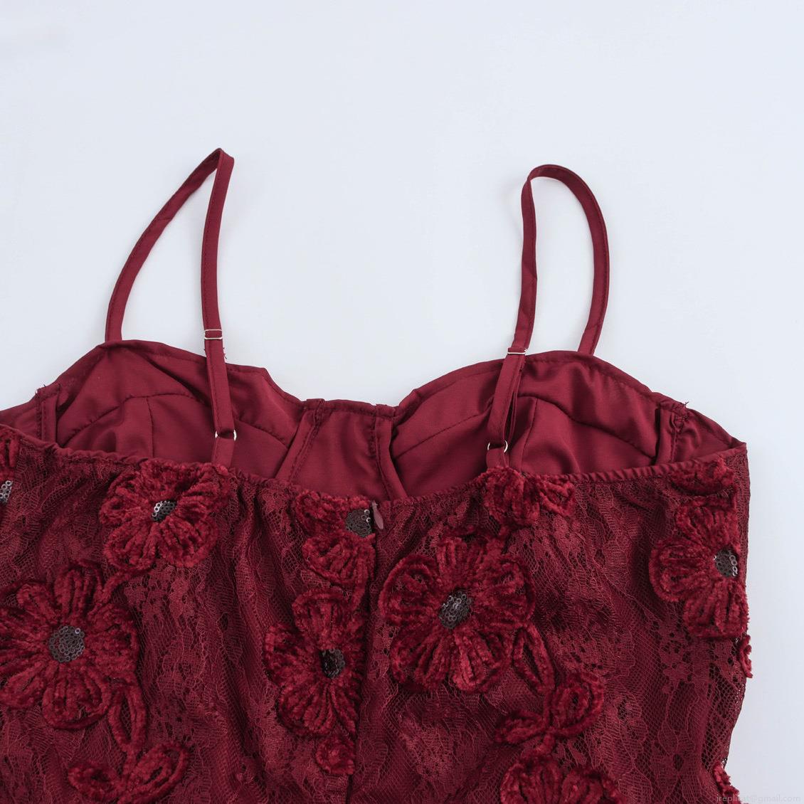 • Elegant Wine Red Sequin Floral Lace Spaghetti Strap Maxi Dress Vintage High Waist Slim Fit Party Evening Gown For Women