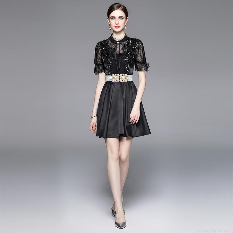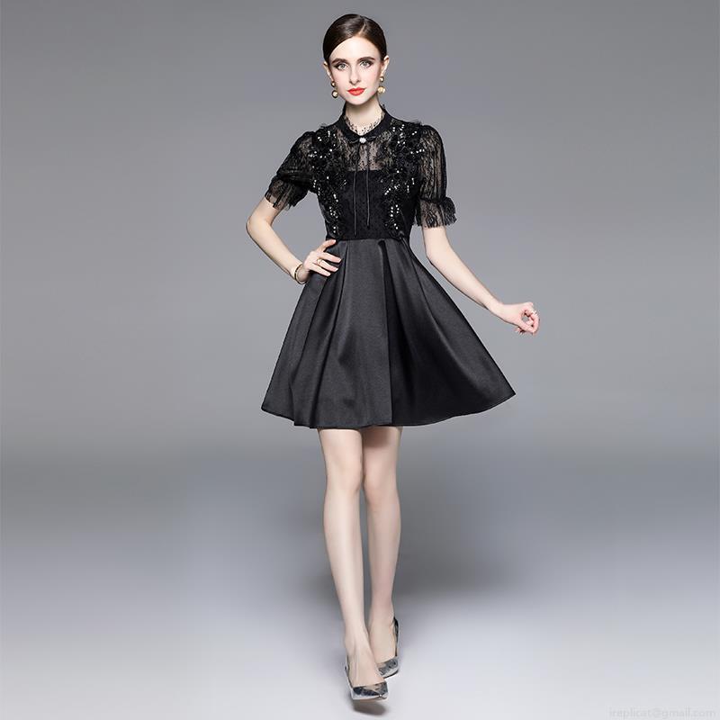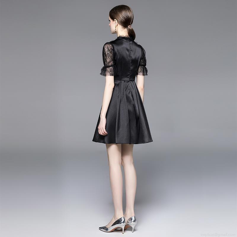 • Elegant Women Black Lace Satin Patchwork Dress Luxury Beading Sequin Stand Collar Short Lantern Sleeve High Waist A-Line Midi Dress For Wedding Party Evening
