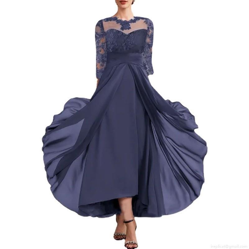• Elegant Women Chiffon Lace Stitching Evening Dress Hollow Out High Low Hem Bridesmaid Gown Short Sleeve One Shoulder Formal Party Prom Dress
