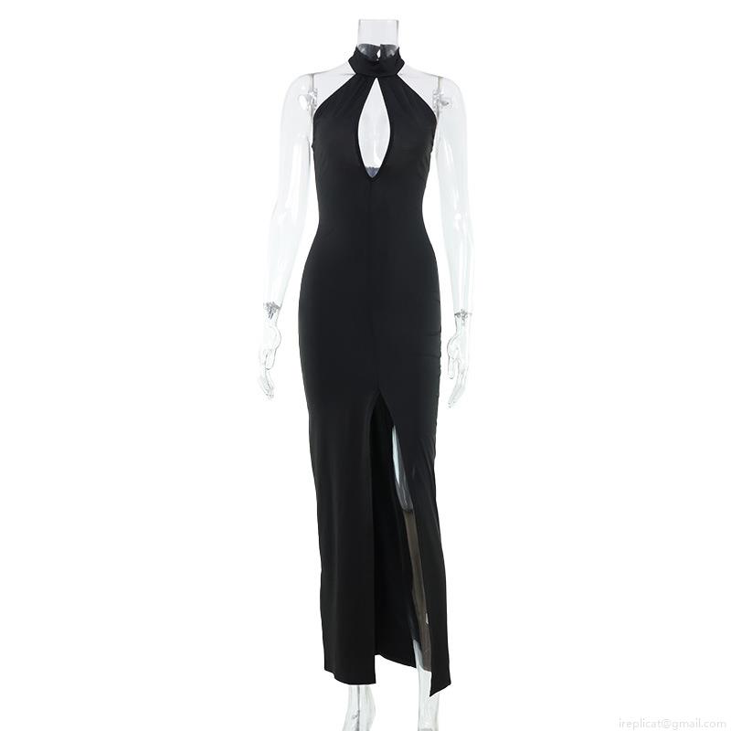• Elegant Women Halter Neck Hollow Out Bodycon Evening Dress Sexy Backless High Slit Solid Color Polyester Gown for Banquet Party Wedding