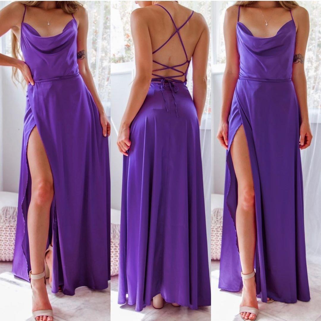 • Elegant Women Satin Cowl Neck Maxi Dress Sexy Backless Crisscross Evening Party Wedding Prom Dress With High Slit Slim Fit Sleeveless Long Dress