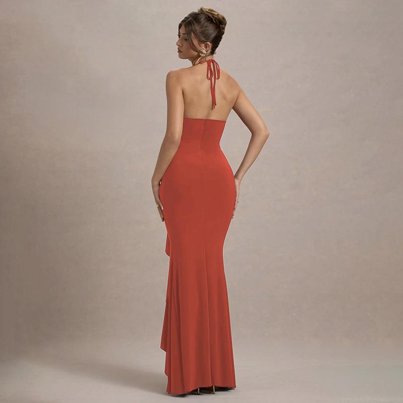 • Elegant Women's Halter Cowl Neck Maxi Dress With 3D Flower Slit Ruffle Detail Backless Evening Party Gown For Socialite Wedding Sexy Lady