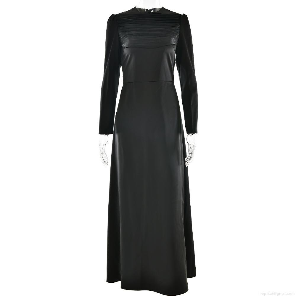 • Elegant Women's Long Sleeve Satin Evening Maxi Dress Pleated Slim Fit Back Drawstring Party Prom Banquet Gown Dress