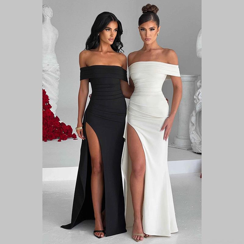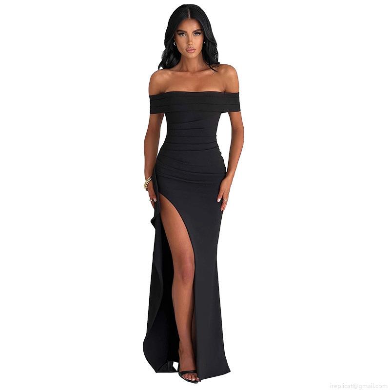• Elegant Women's Off-The-Shoulder High Slit Evening Gown Slim Fit Ruched Bodycon Maxi Dress For Party Wedding Banquet Formal Occasion Sexy Clubwear