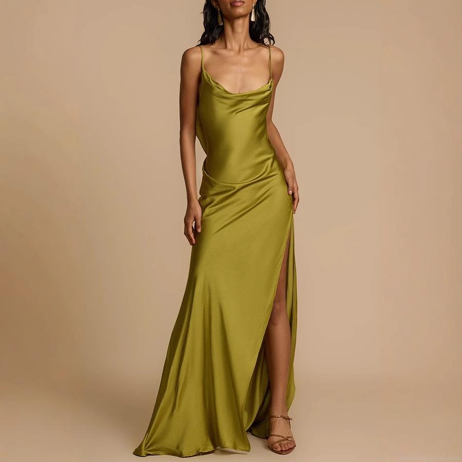 Elegant Women's Satin Maxi Dress Cowl Neck Backless Ruffle Evening Party Dress With High Slit Solid Color Sleeveless Sexy Prom Gown