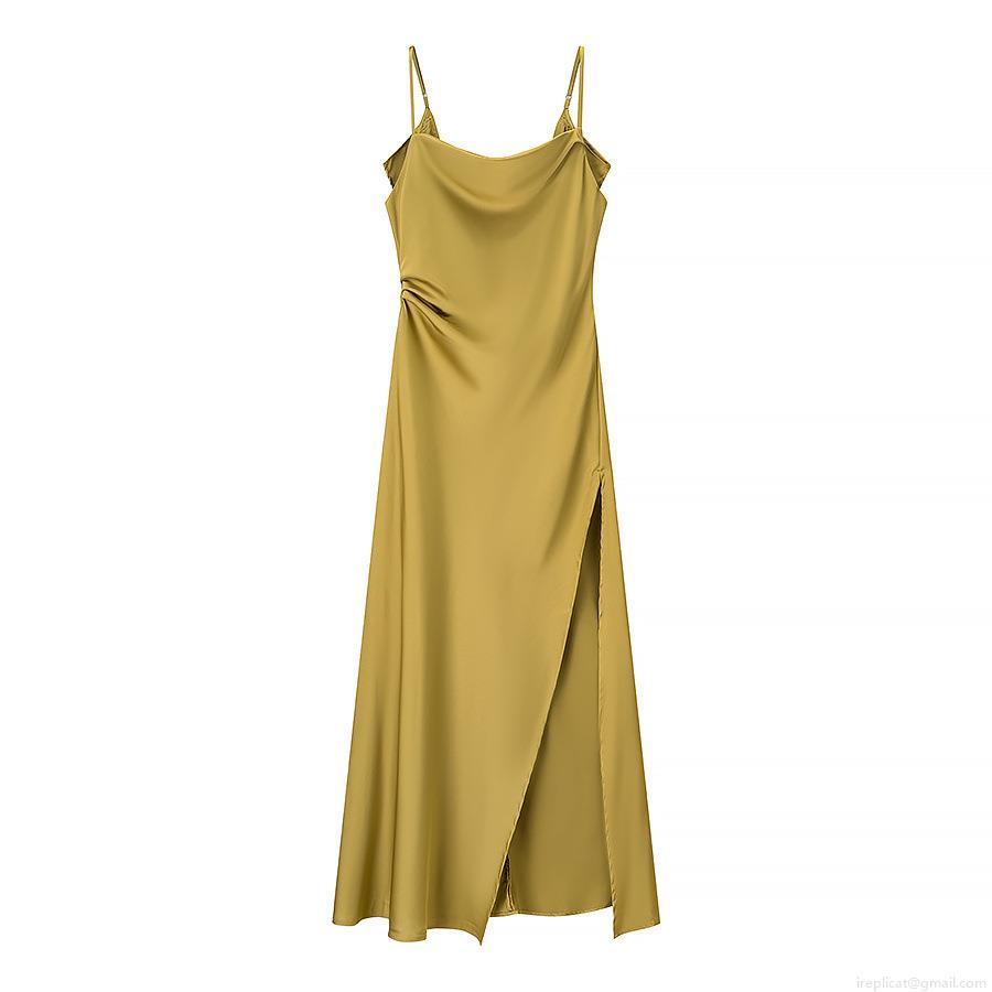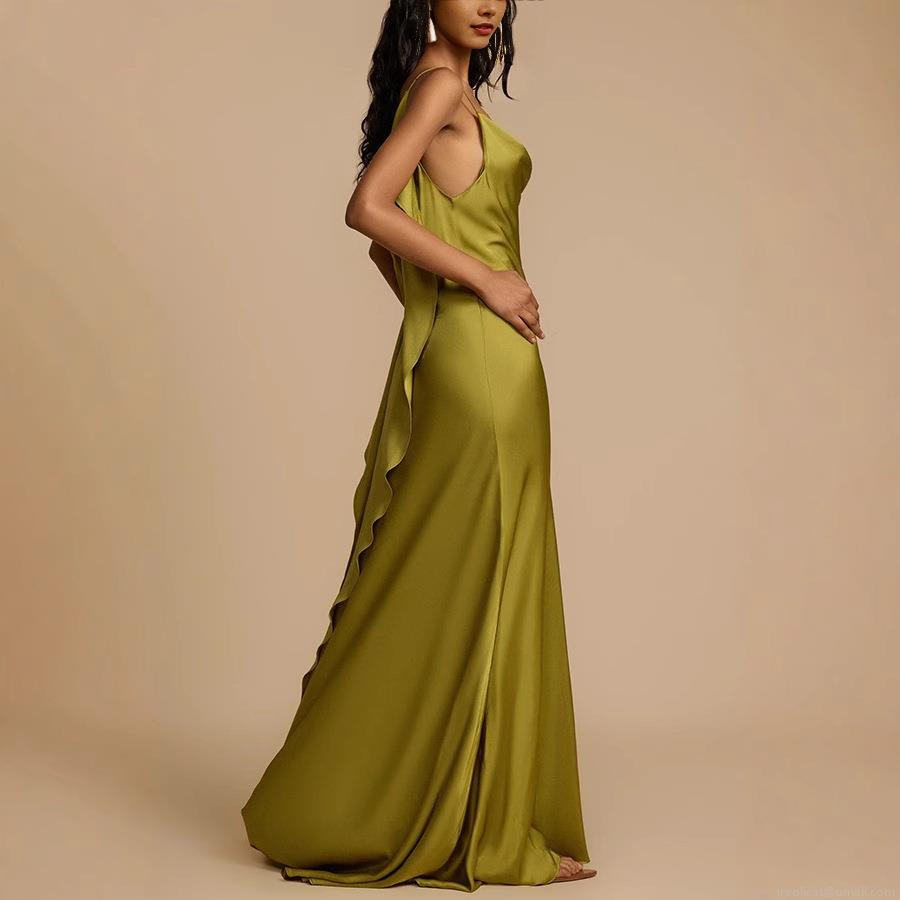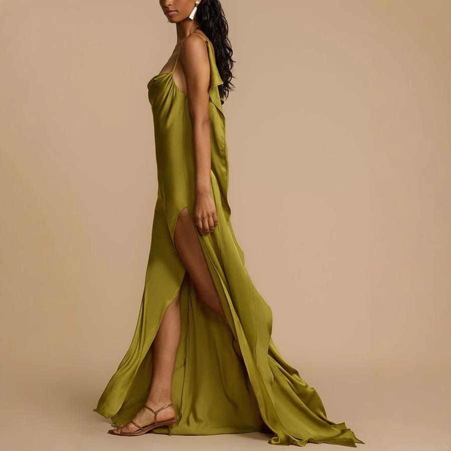 • Elegant Women's Satin Maxi Dress Cowl Neck Backless Ruffle Evening Party Dress With High Slit Solid Color Sleeveless Sexy Prom Gown