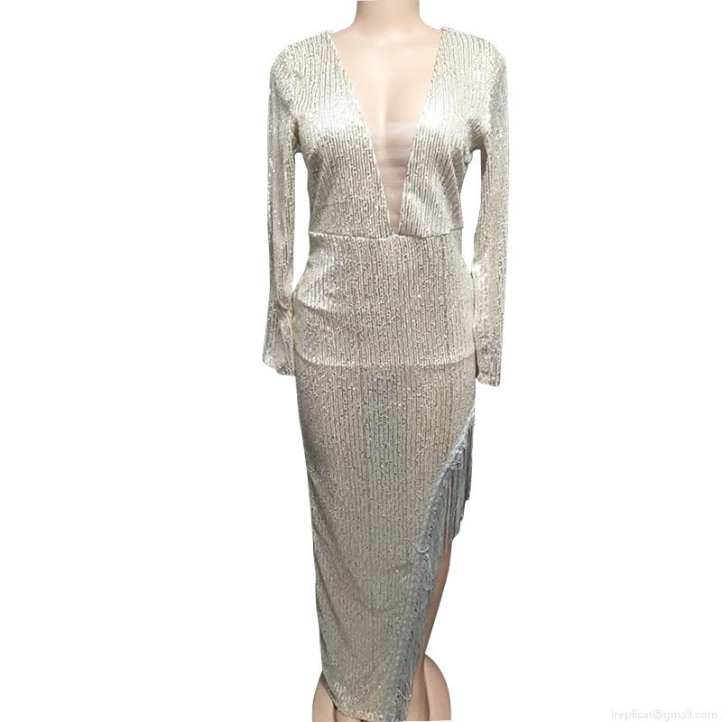 Elegant Women's V-Neck Sequin Long Sleeve Maxi Dress With Tassel Hem High Slit Sparkly Party Evening Gown For Wedding Ceremonies And Prom Night Club Sexy Bodycon Cocktail Outfits