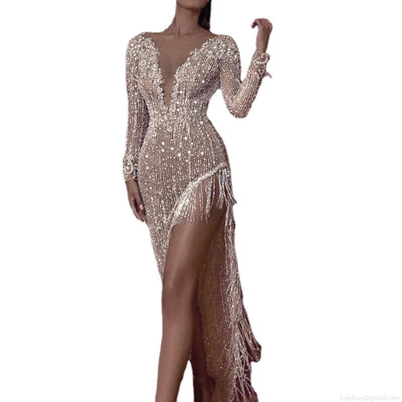 • Elegant Women's V-Neck Sequin Long Sleeve Maxi Dress With Tassel Hem High Slit Sparkly Party Evening Gown For Wedding Ceremonies And Prom Night Club Sexy Bodycon Cocktail Outfits