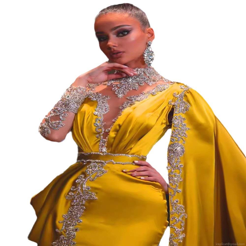 Elegant Yellow Satin Sequin Evening Dress Women One Shoulder Cloak Sleeve Mermaid Maxi Gown For Wedding Party Banquet Prom Luxury Slim Fit Rhinestone Dress