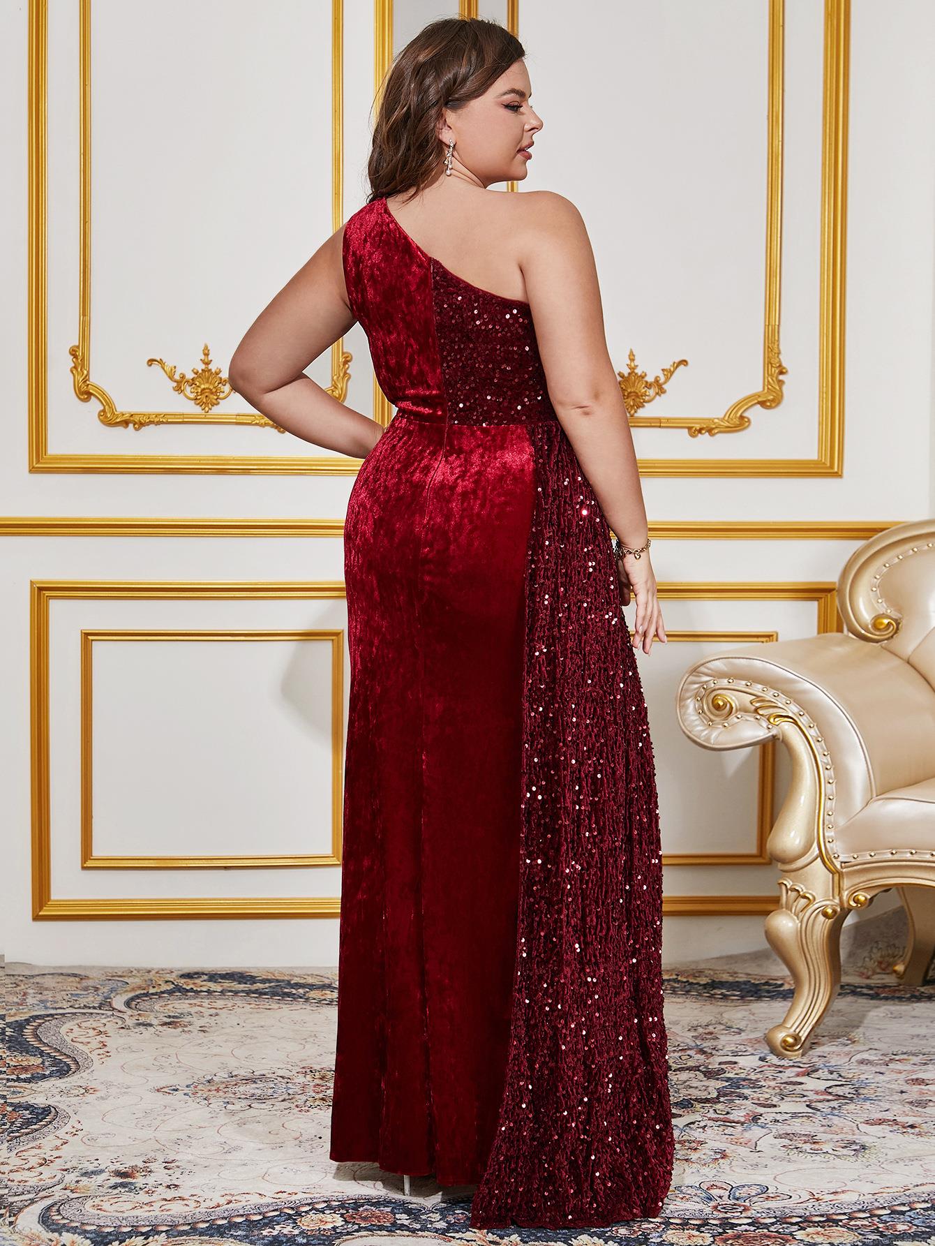 • Plus Size One Shoulder Sequin Velvet Evening Maxi Dress Elegant High Slit Party Banquet Gown For Women Burgundy Wedding Dress