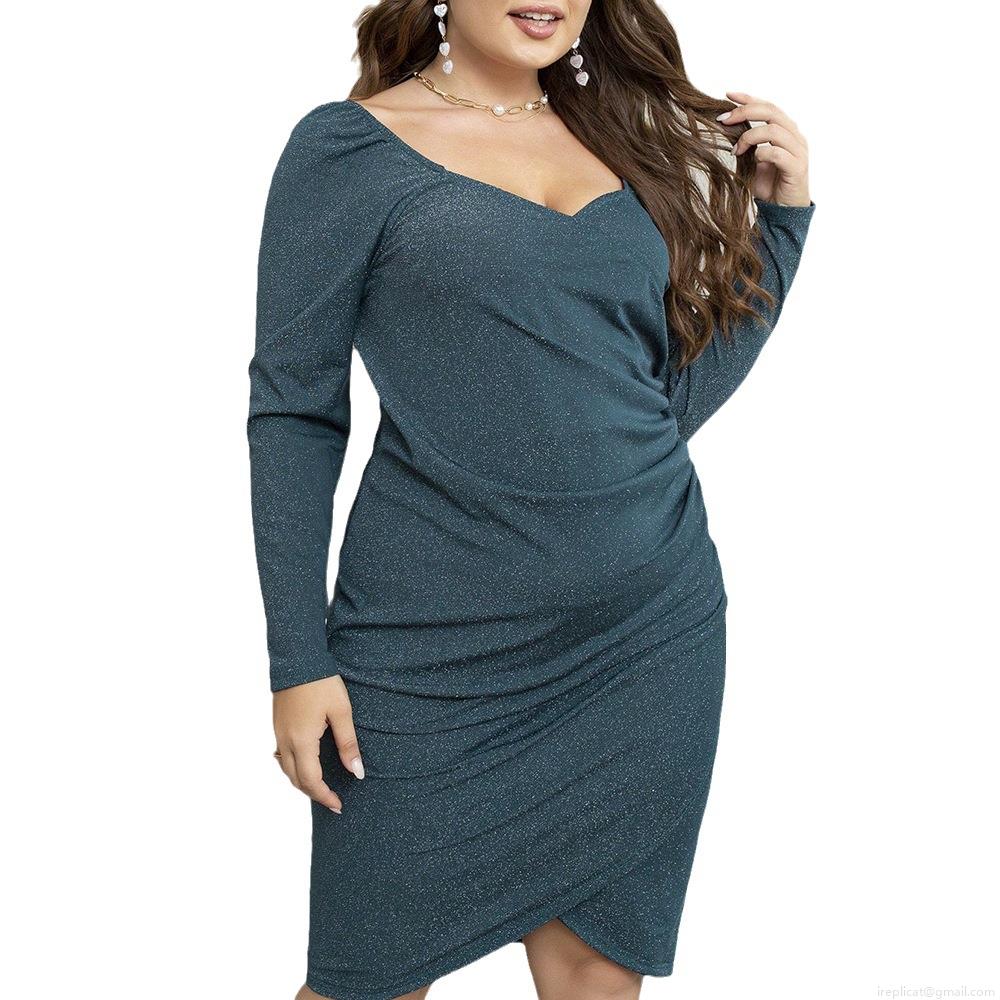 • Plus Size Women V-Neck Glitter Ruched Midi Dress Elegant Sexy Long Sleeve Bodycon Evening Party Gown Solid Teal Blue Polyester Dress