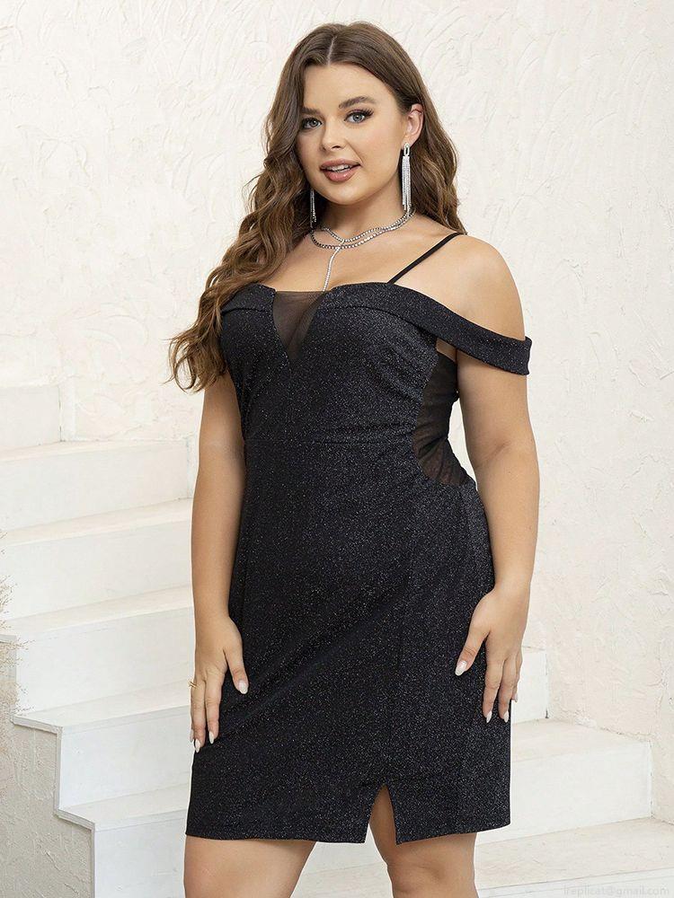 • Plus Size Women's Sexy Off Shoulder Mini Dress Mesh Patchwork Glitter Bodycon Elegant Evening Party Banquet Short Dress For Ladies