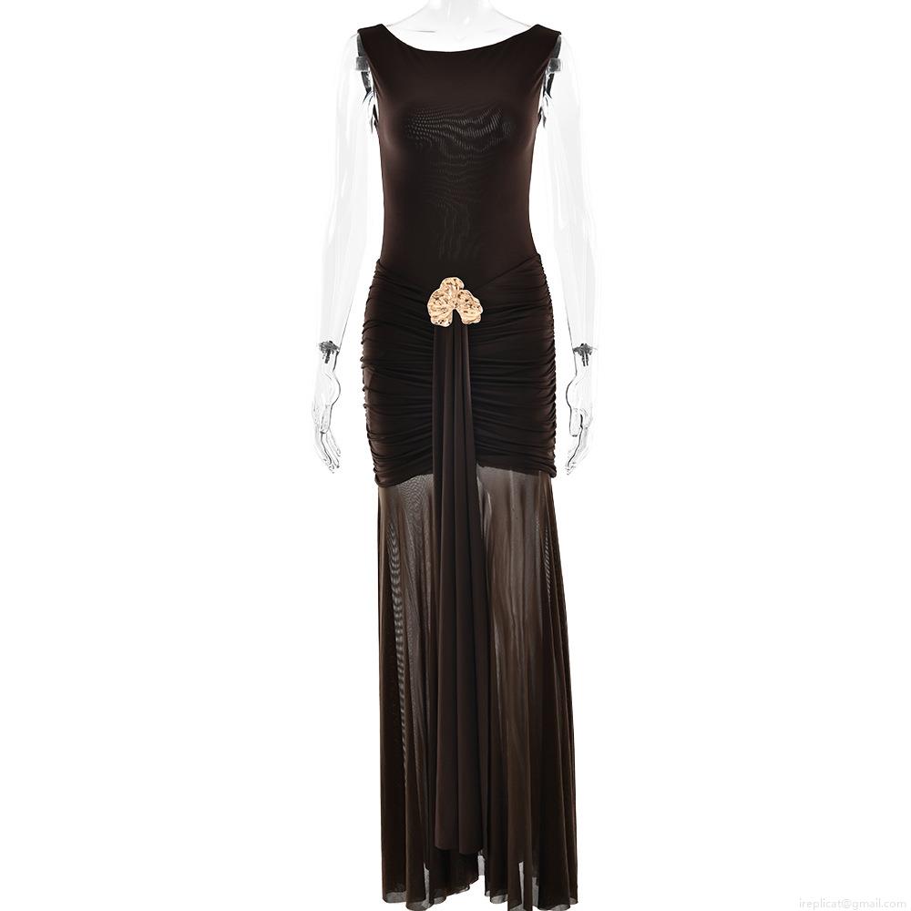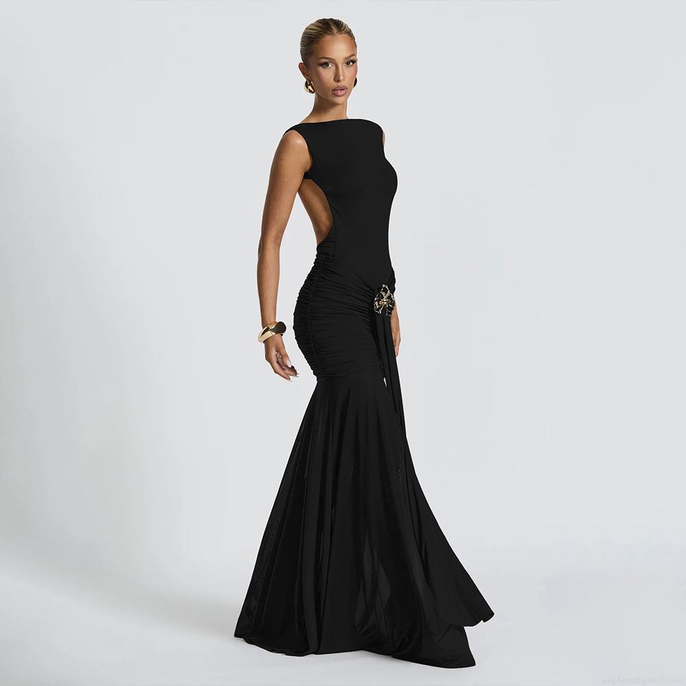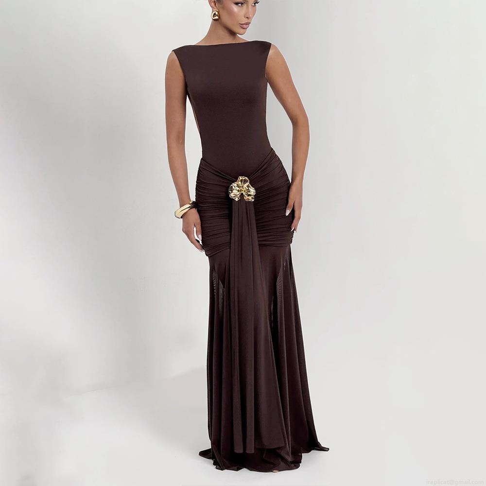 • Sexy Backless Maxi Dress For Women Milk Silk Mesh Pleated Bodycon Evening Dress With Metal Buckle High Slit Sleeveless Party Long Gown