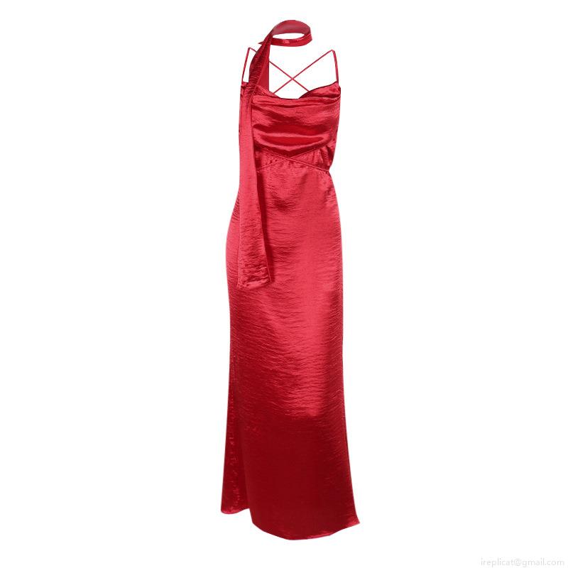 • Sexy Backless Red Satin Cami Maxi Dress Elegant Ruched Bodycon Evening Party Gown With Streamer For Women Elegant Celebrity Style Polyester Spandex