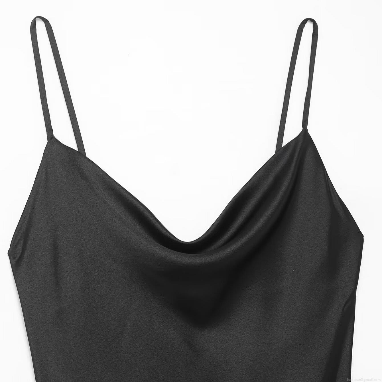 Sexy Black Satin Backless Midi Dress With Velvet Splicing And Fringe Detail Cowl Neck Spaghetti Strap Evening Party Bodycon Dress For Women