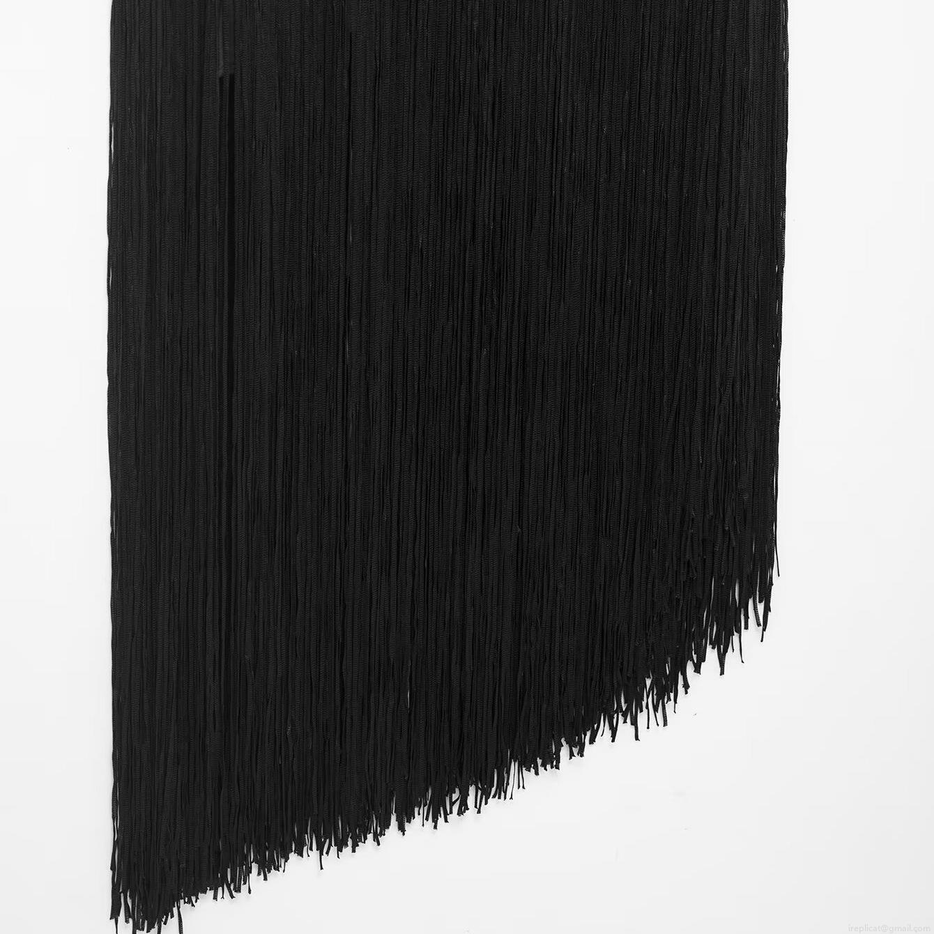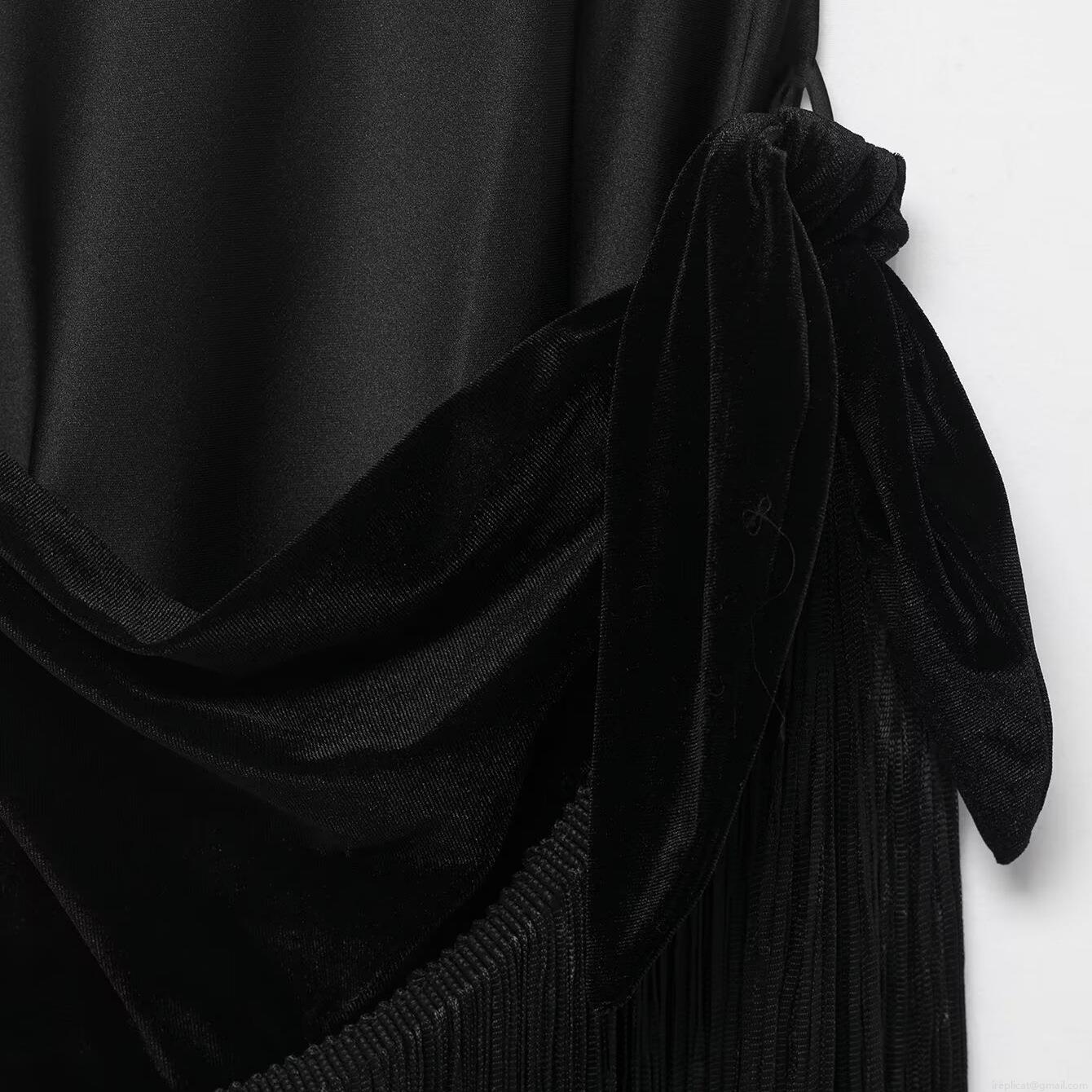 • Sexy Black Satin Backless Midi Dress With Velvet Splicing And Fringe Detail Cowl Neck Spaghetti Strap Evening Party Bodycon Dress For Women