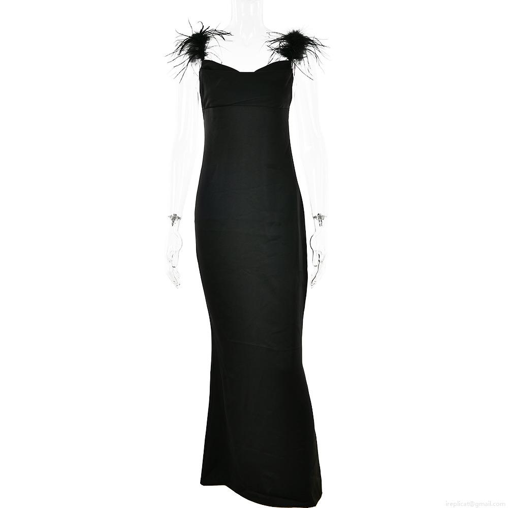 Sexy Black Satin Cowl Neck Maxi Dress With Feather Straps Backless Sleeveless Party Evening Long Gown For Women