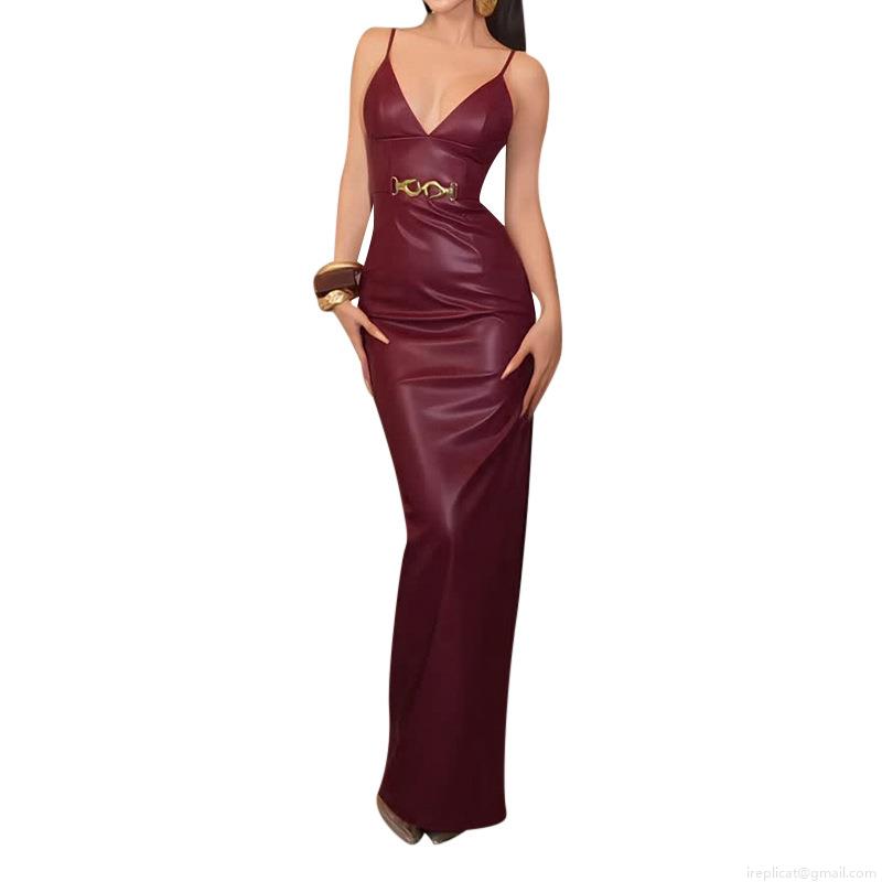• Sexy Burgundy PU Leather Maxi Dress Women Deep V Neck High Split Evening Party Gown Bodycon High Waist Dress With Metal Buckle Decoration