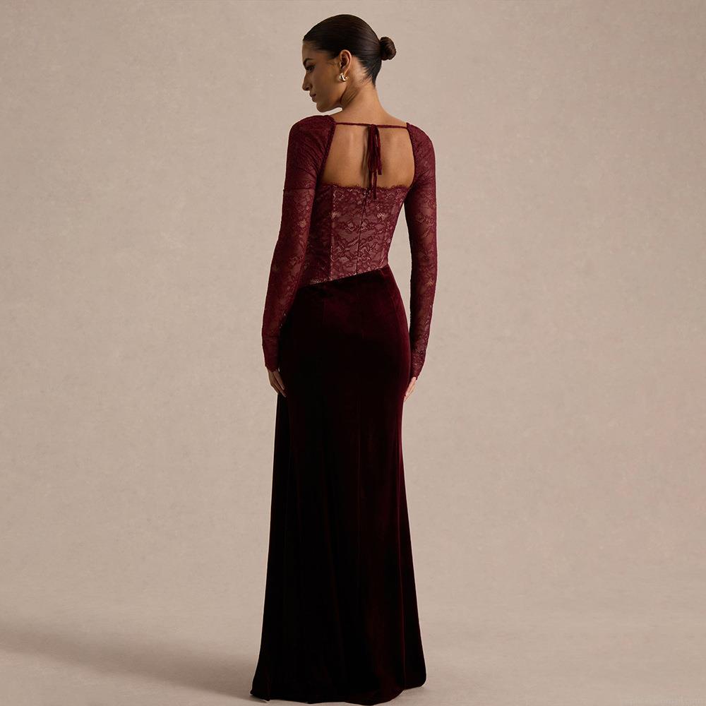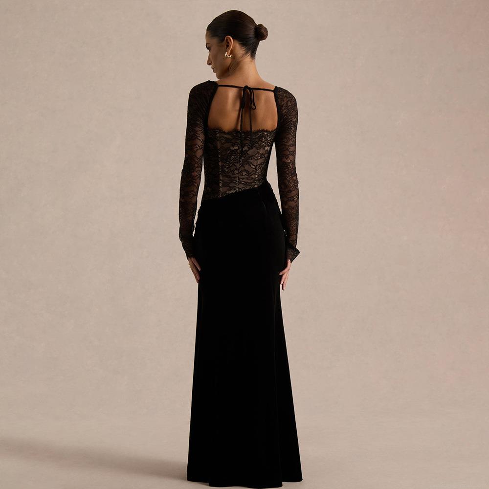 • Sexy Elegant Lace Patchwork Korean Velvet Maxi Dress for Women Long Sleeve Square Neck Backless High Slit Bodycon Evening Party Gown