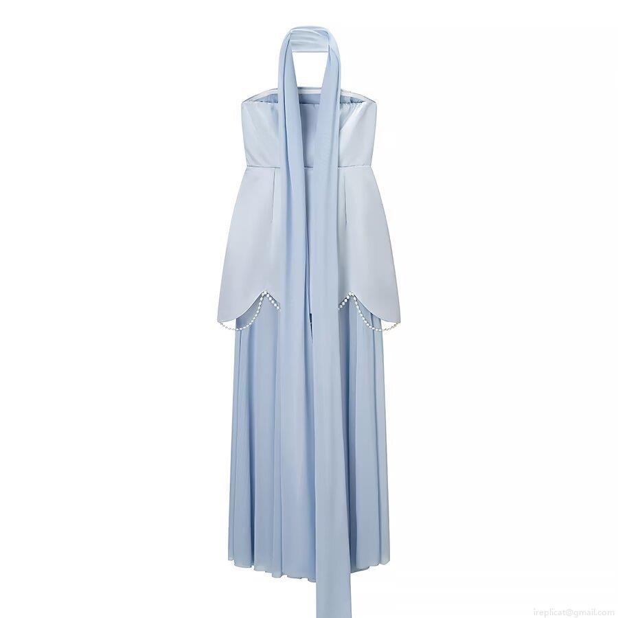 • Sexy Halter Backless Satin Mesh Splicing Maxi Dress With Scarf And Pearl Chain Decoration For Women Party Evening Banquet Elegant Long Dress