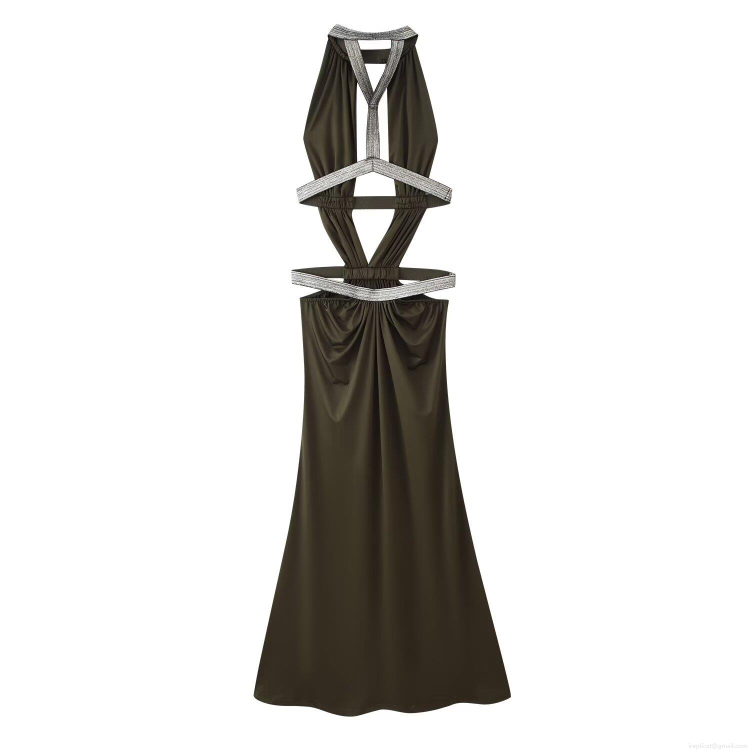Solid Color, Hollow Out, Neckband, Backless, Showing Off Your Waist, Rhinestone Edging