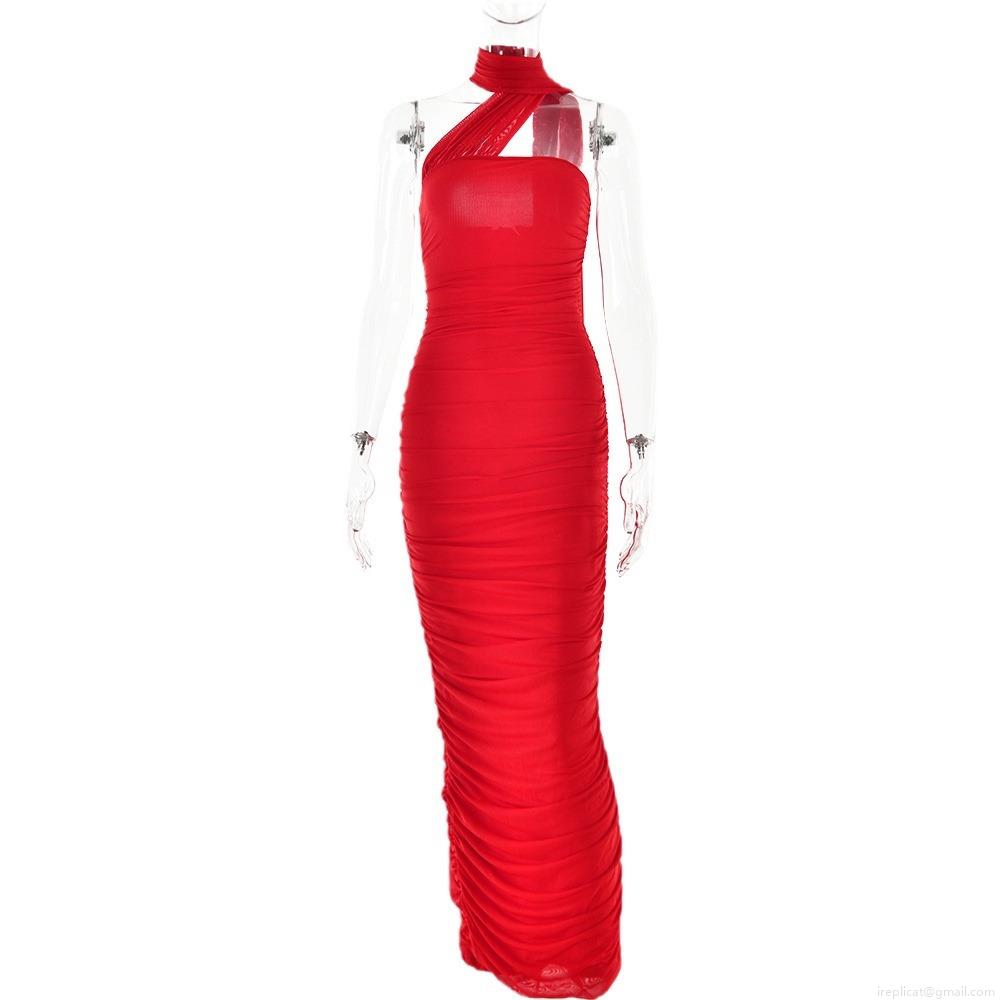 • Sexy Halter One Shoulder Ruched Maxi Dress For Women Backless Slit Mesh Long Gown For Evening Party Club Night Out Summer Solid Color Bodycon Dress