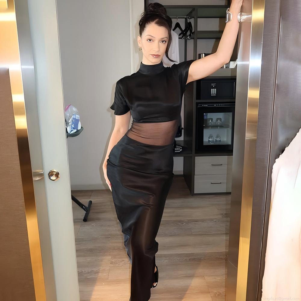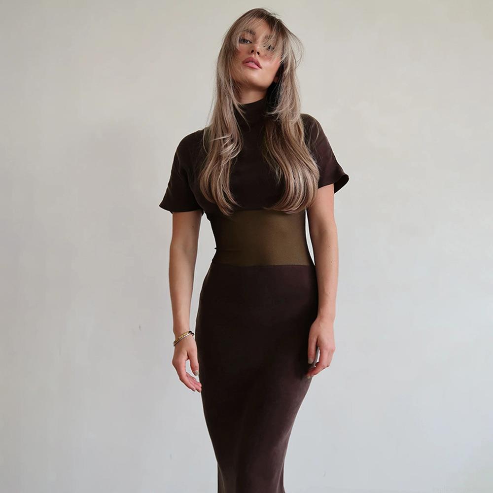 Sexy Mock Neck Short Sleeve Mesh Patchwork Satin Maxi Dress For Women Elegant Floor Length Party Evening Clubwear Bodycon Dress Solid Color Formal Gown