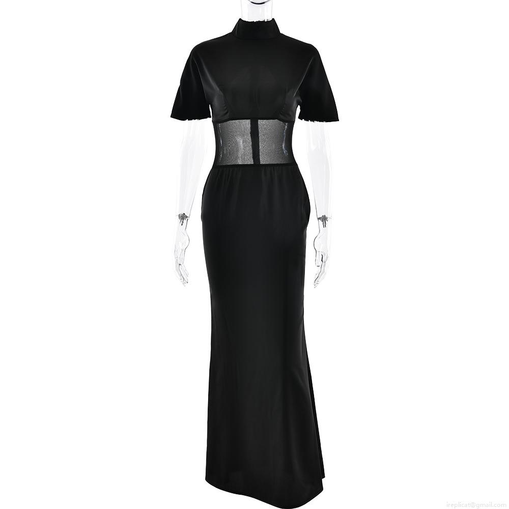 • Sexy Mock Neck Short Sleeve Mesh Patchwork Satin Maxi Dress For Women Elegant Floor Length Party Evening Clubwear Bodycon Dress Solid Color Formal Gown