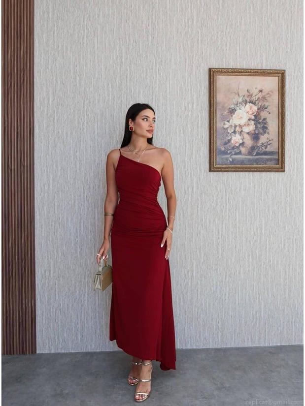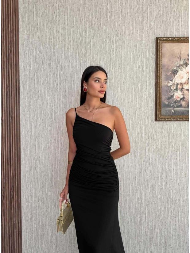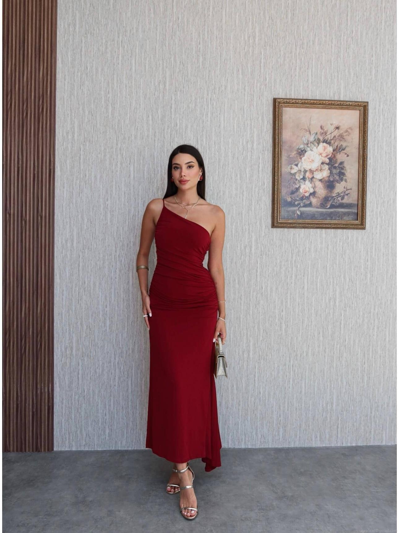 • Sexy One Shoulder Ruched Maxi Dress Women Asymmetrical Irregular Hem Slim Fit Evening Party Gown Milk Silk Bodycon Dress