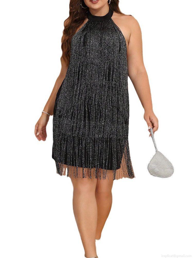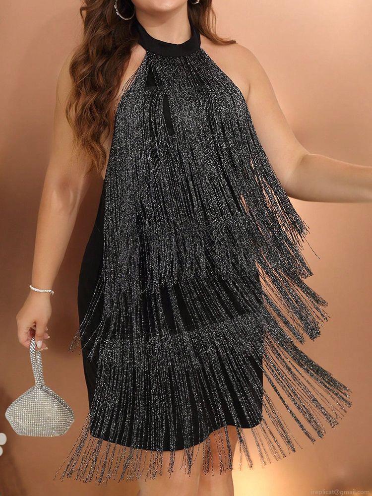 • Sexy Plus Size Halter Tassel Mini Dress For Women Glitter Silver Fringe Backless Bodycon Party Club Evening Dress Polyester Spandex High Stretch