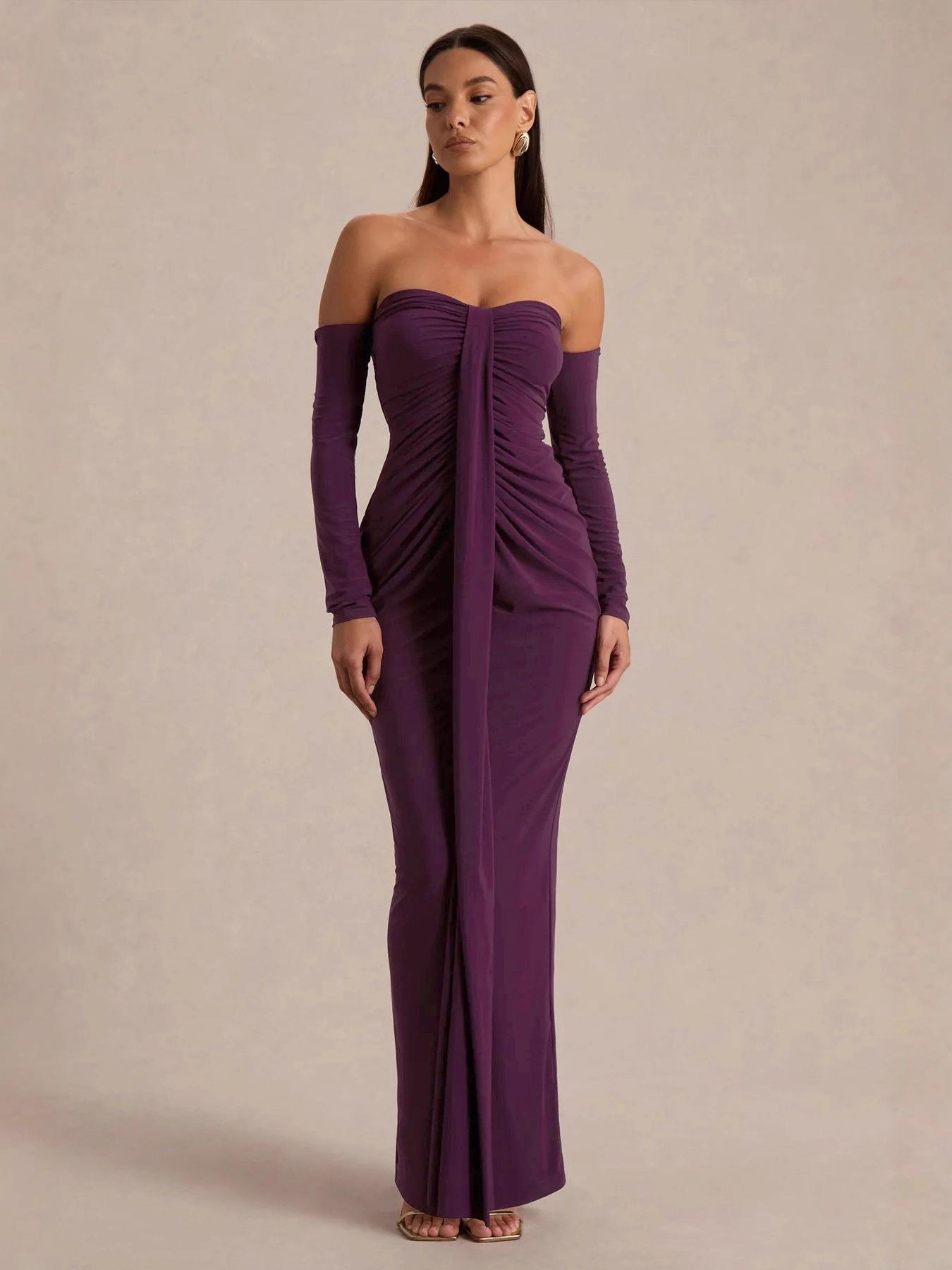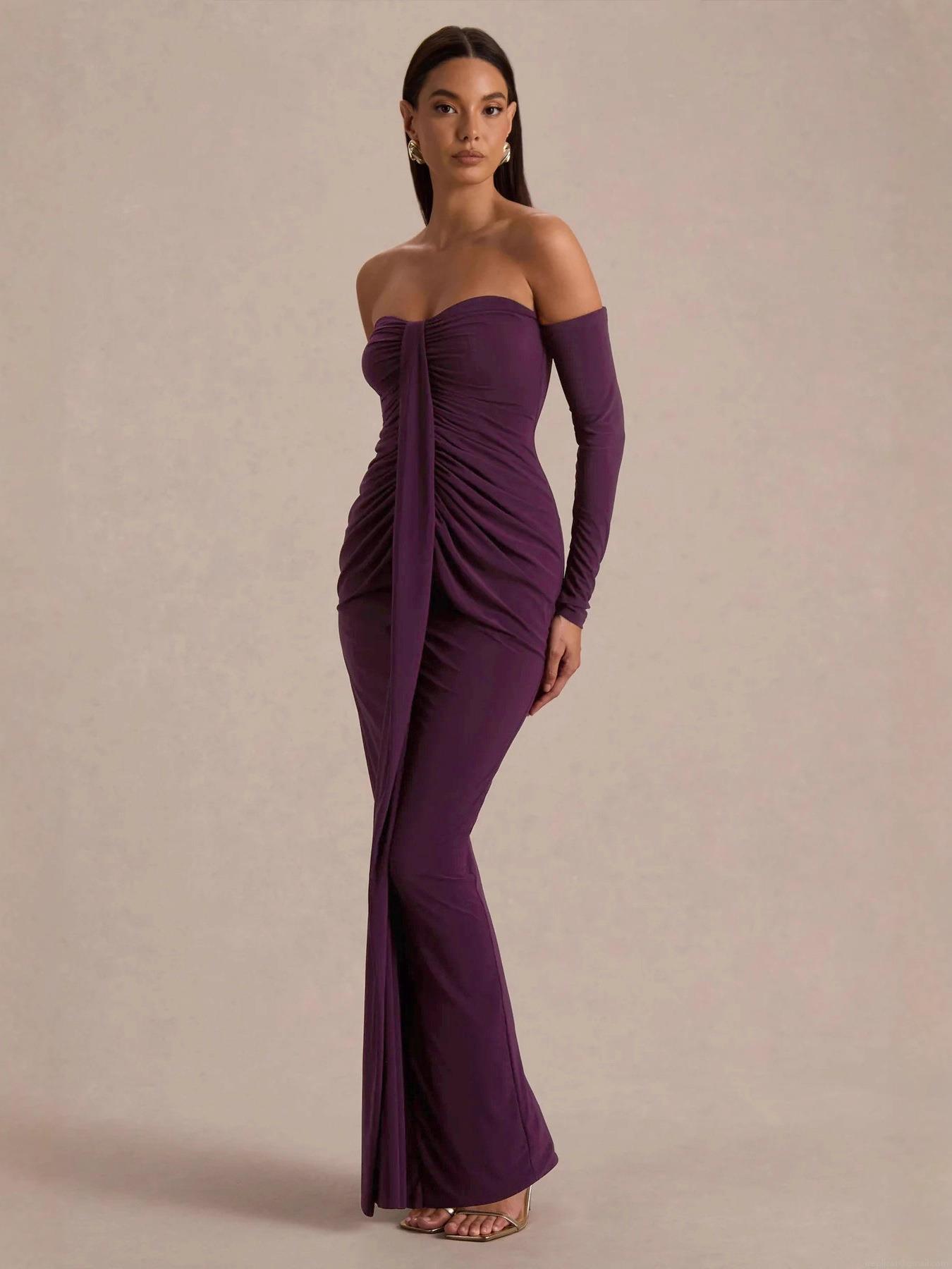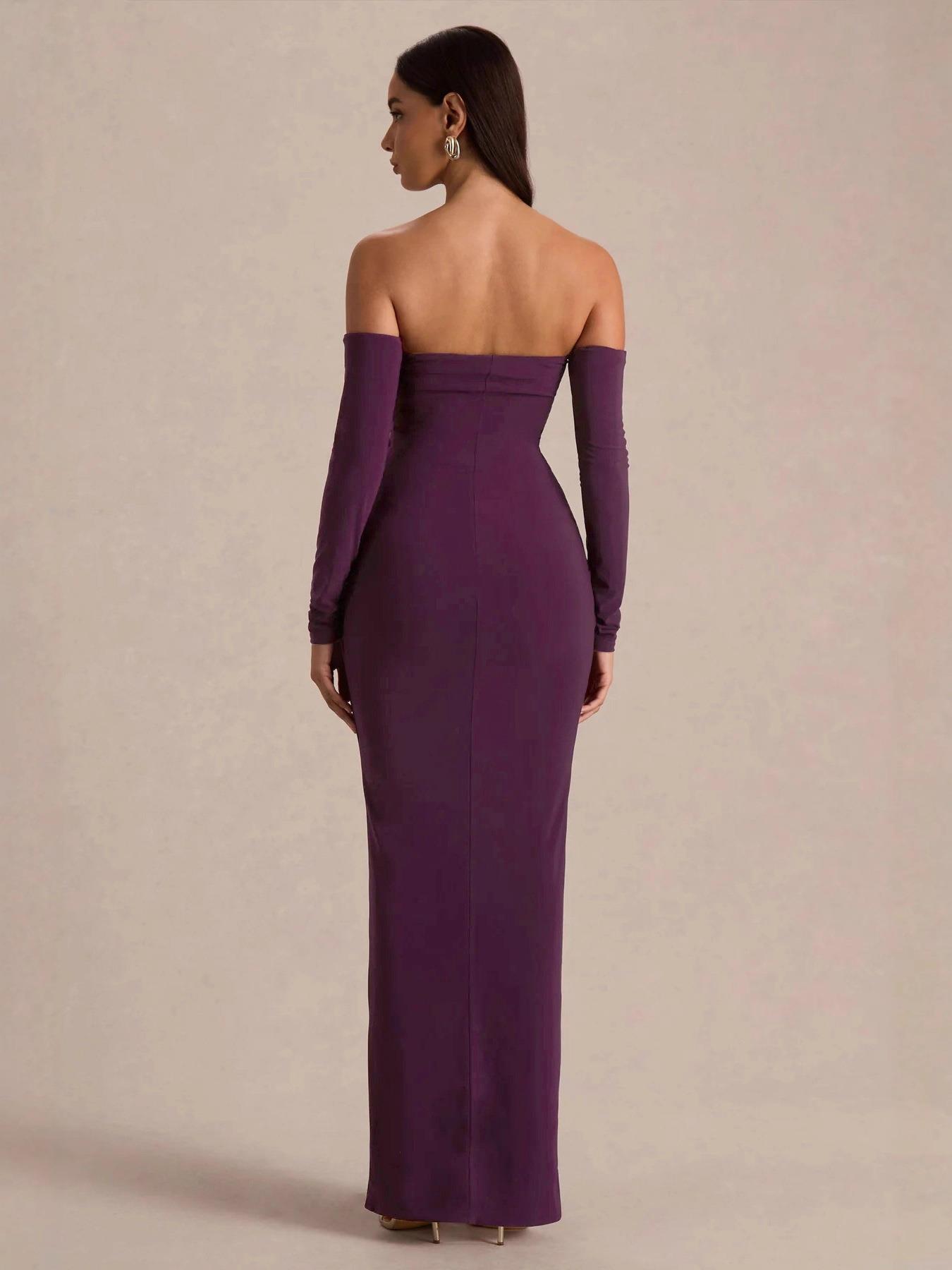 • Sexy Purple Ruched Bodycon Evening Dress With Separate Long Sleeve Covers High Elastic Milk Silk Strapless Maxi Dress For Banquet Party Clubwear