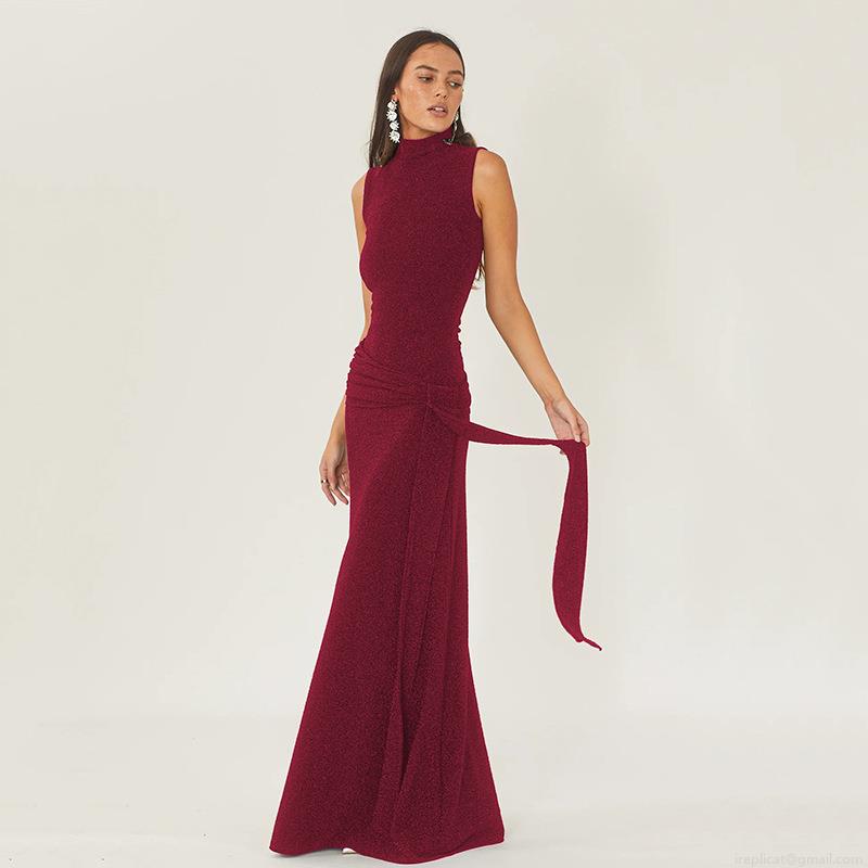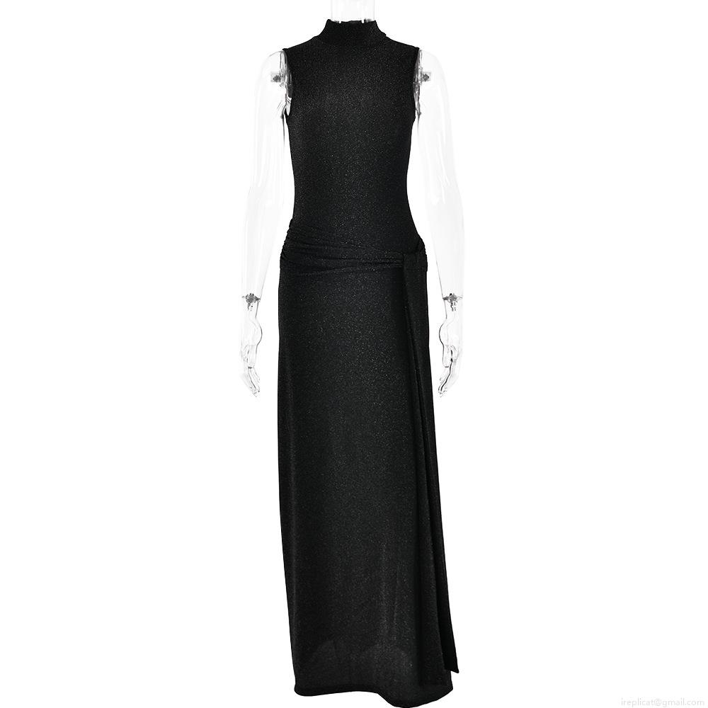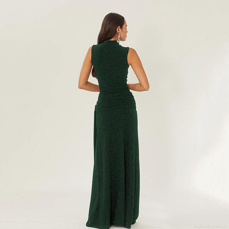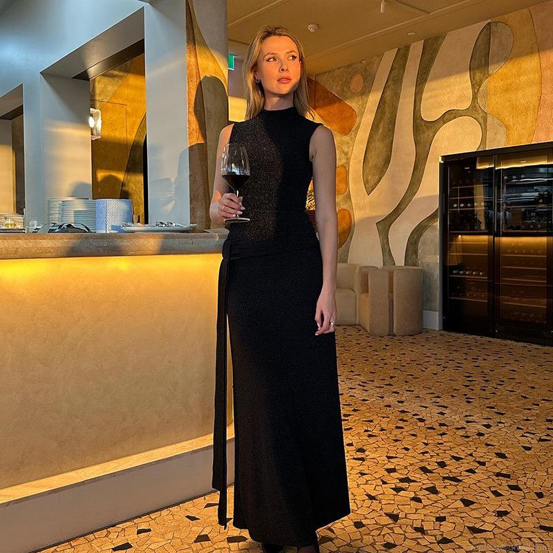 • Sexy Sleeveless Round Neck Glitter Silk Fishtail Maxi Dress Ruched Slim Fit Evening Party Long Dress For Women Polyester Glitter Fabric Occasion Dress