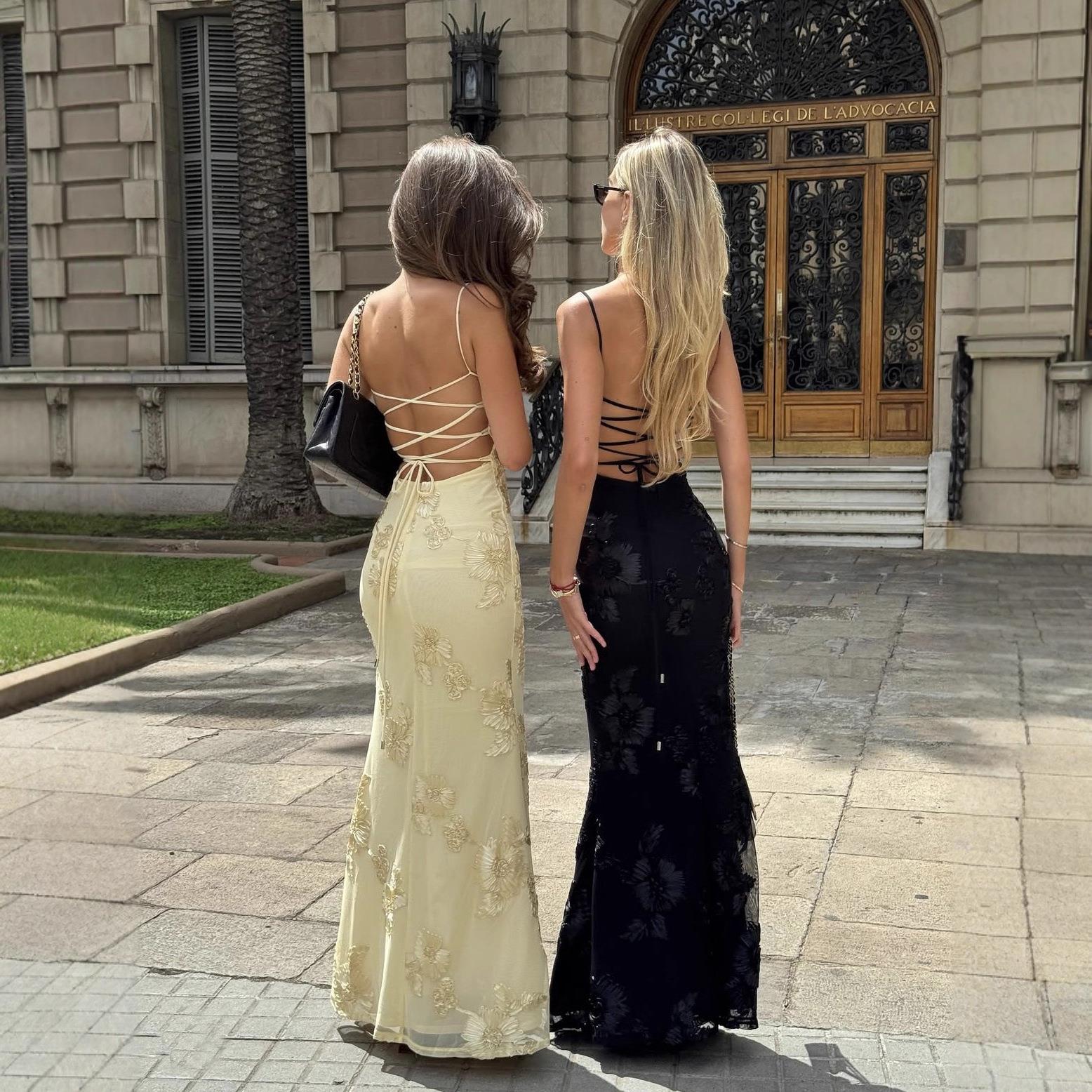 • Sexy Women 3D Flower Applique Backless Maxi Dress Spaghetti Strap Bodycon Mermaid Party Dress Elegant Evening Wedding Guest Long Gown