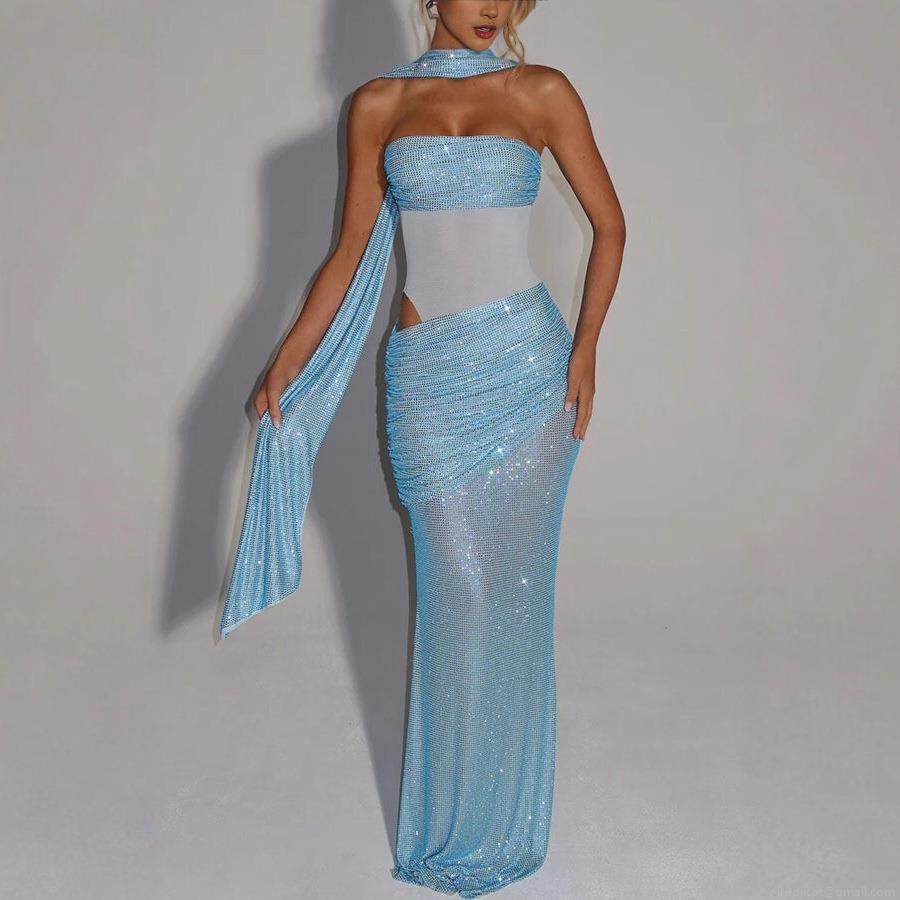 • Sexy Women Sequin Strapless Maxi Dress With Scarf Sparkling Rhinestone Mesh Patchwork Cutout Bodycon Long Dress For Party Banquet Evening Gown
