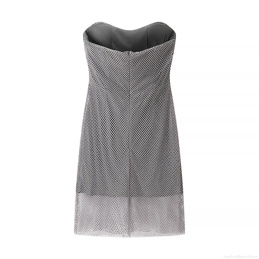 Sexy Women's Strapless Rhinestone Mesh Mini Dress Slim Fit Bodycon Hollow Out Silver Party Club Evening Wear Polyester Dress