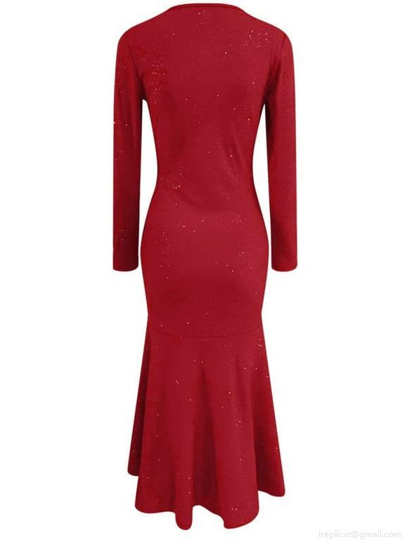 • Women Deep V-Neck Long Sleeve Sequin Dress Sexy Slim Fit Irregular Hem Ruffle Bodycon Maxi Gown for Evening Party Wedding Banquet Elegant Red Sparkly Clothing