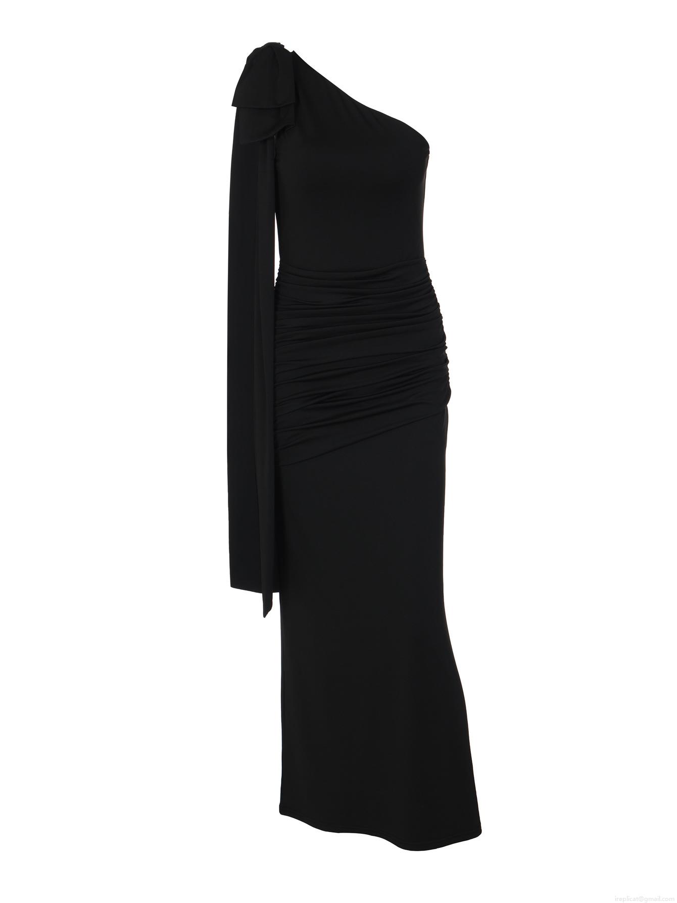 • Women Elegant One Shoulder Maxi Dress Ruched Bodycon Evening Party Dress With Bow Shoulder Detail Polyester Spandex Sexy Slim Fit Formal Gown