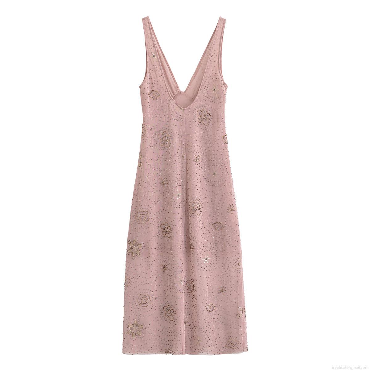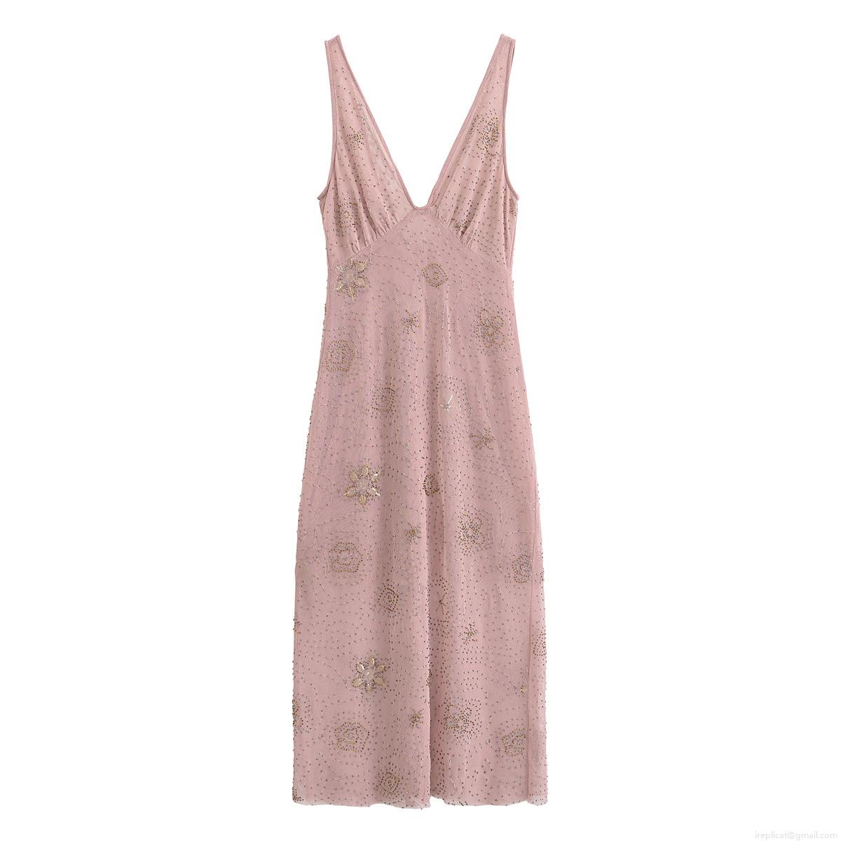 • Women Elegant Pink Sequin Mesh Midi Dress Deep V Neck Sleeveless Evening Party Gown With Heavy Beading Embroidery Luxury Formal Occasion Dress